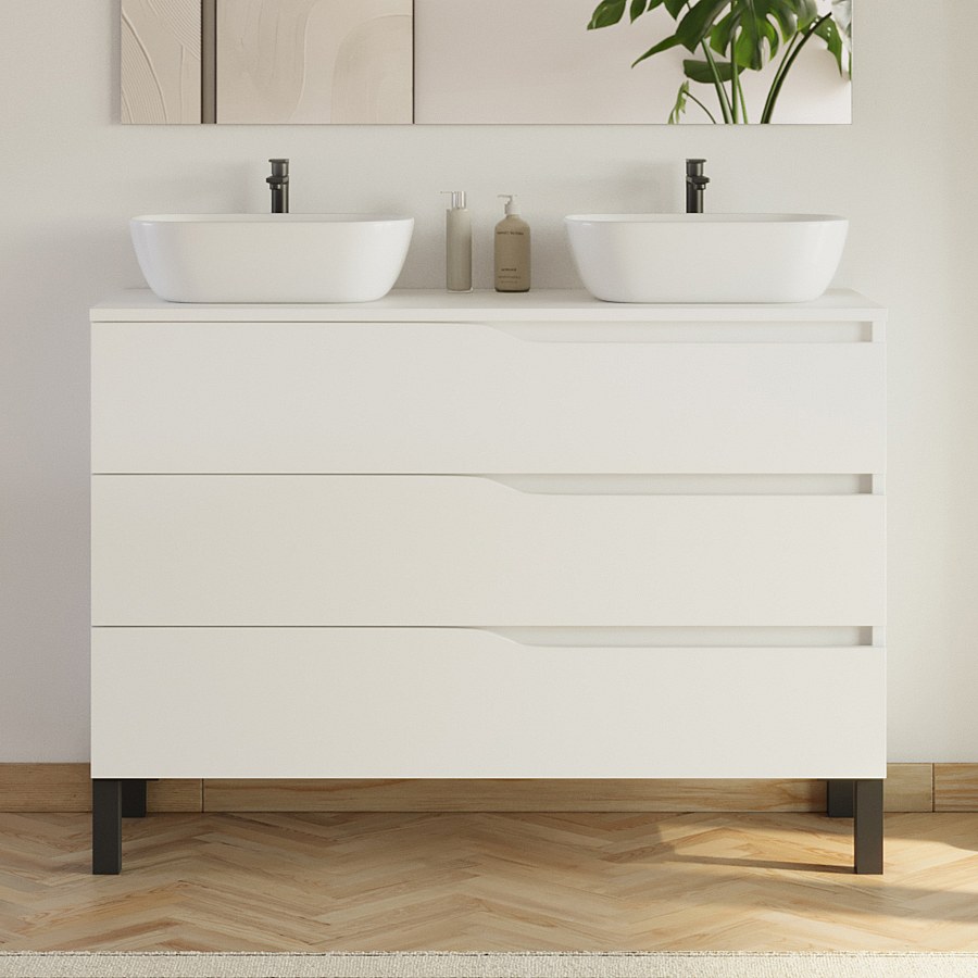 Meuble de salle de bain 120cm avec plateau et 2 vasques à poser Zeus - 3 tiroirs - sans miroir - blanc - MATA