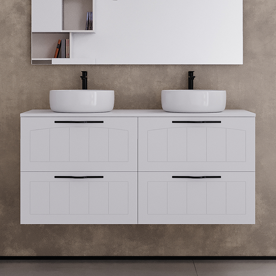 Meuble de salle de bain 120cm avec plateau et deux vasque à poser rondes - 4 tiroirs - sans miroir - blanc - PIA
