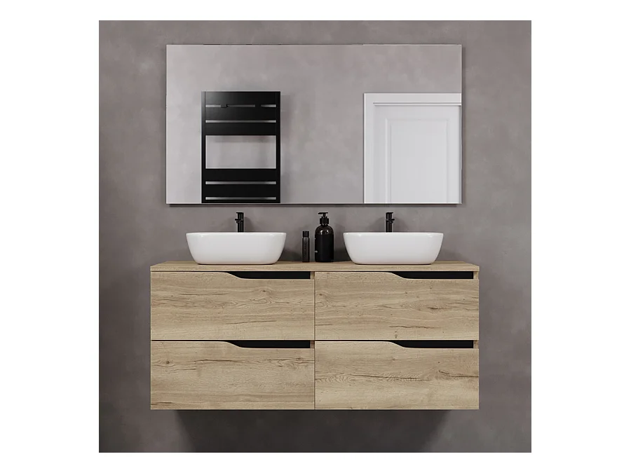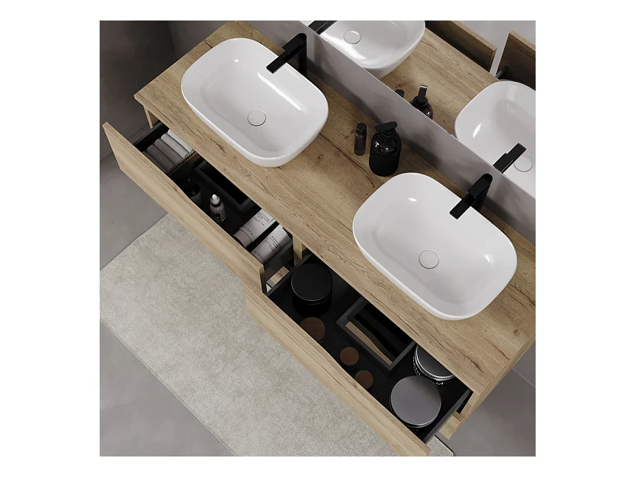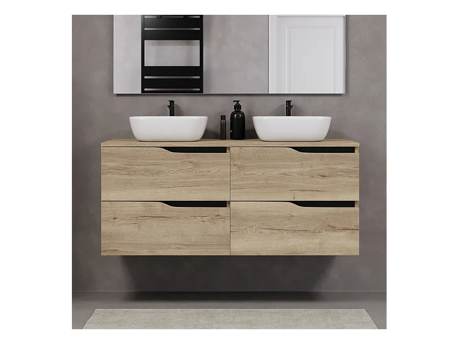 Meuble de salle de bain 120cm avec plateau et deux vasques à poser zeus - 4 tiroirs - madera miel (chêne clair) - LUNA