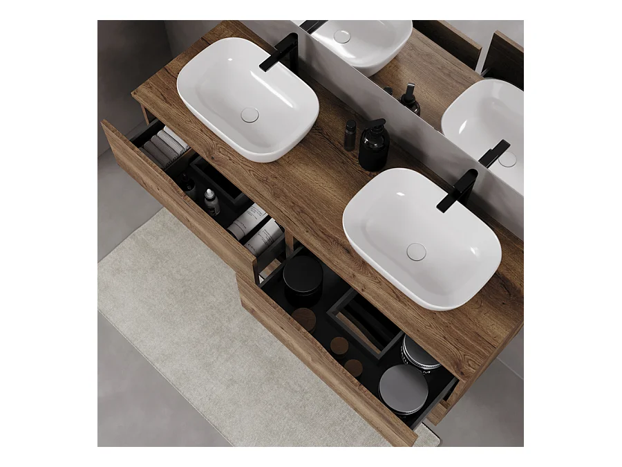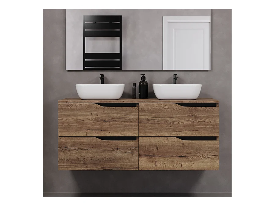 Meuble de salle de bain 120cm avec plateau et deux vasques à poser zeus - 4 tiroirs - sans miroir - tabaco (chêne foncé) - LUNA