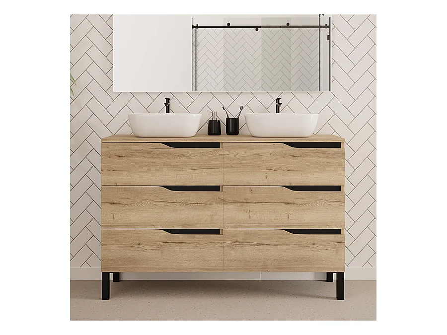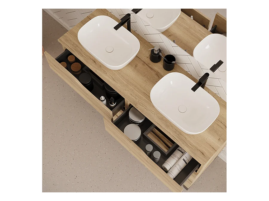 Meuble de salle de bain 120cm avec plateau et deux vasques à poser zeus - 6 tiroirs - sans miroir - madera miel (chêne clair) - MATA
