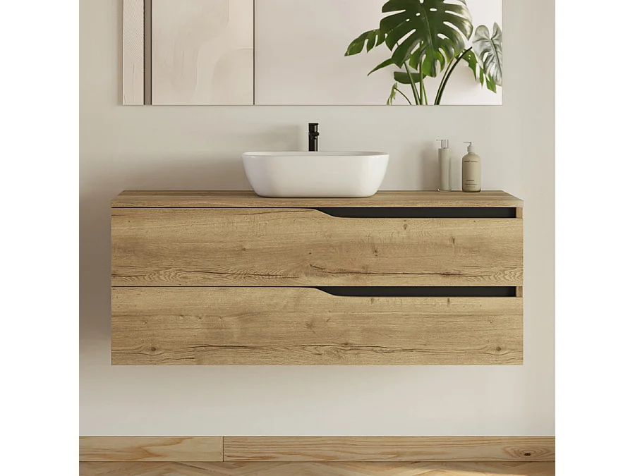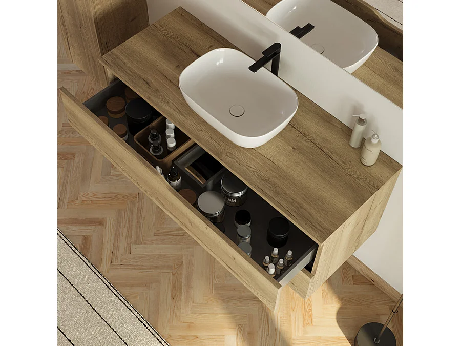 Meuble de salle de bain 120cm avec plateau et vasque ronde Zeus - 2 tiroirs et colonne de rangement - madera miel (bois clair) - LUNA