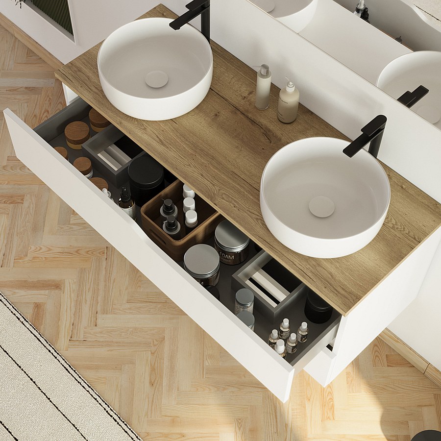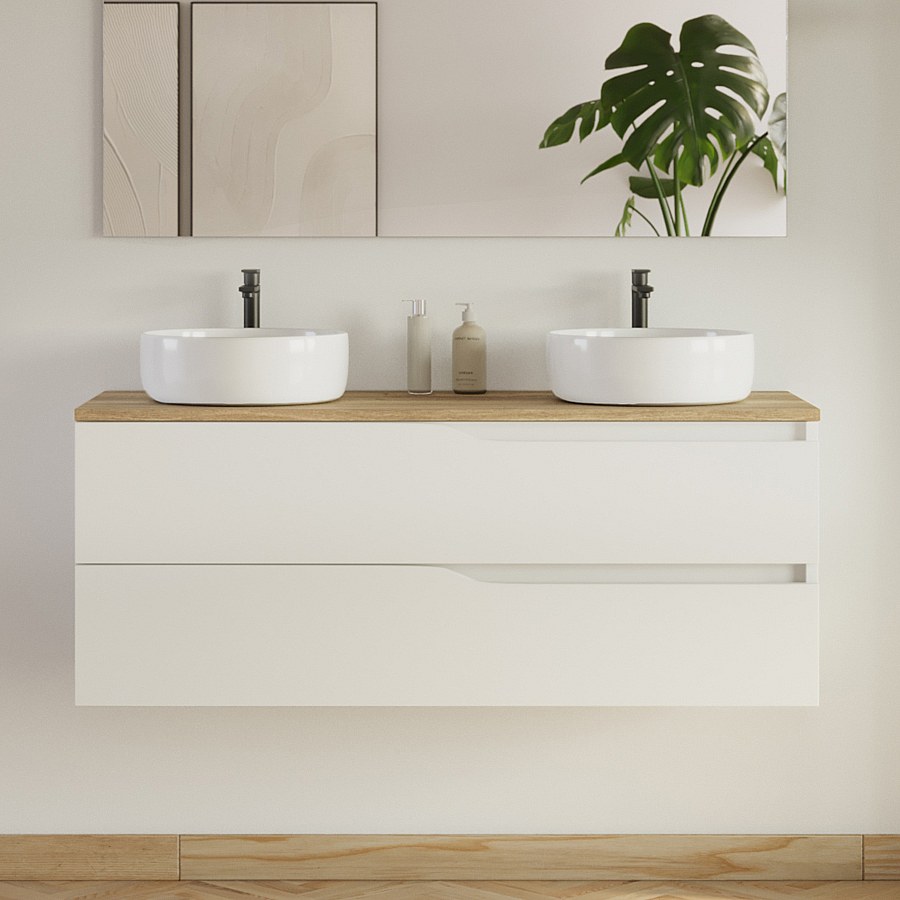 Meuble de salle de bain 120cm avec plateau miel et 2 vasques à poser Ares - 2 tiroirs - sans miroir - blanc - LUNA