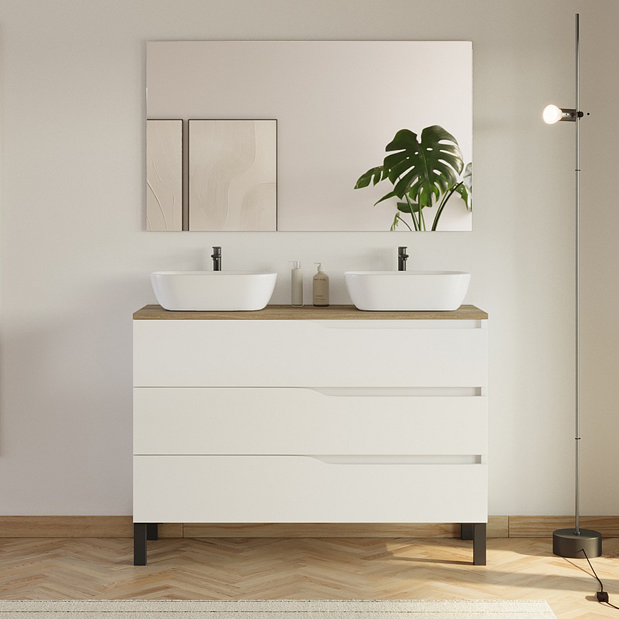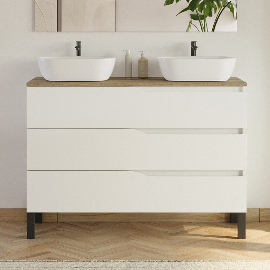 Meuble de salle de bain 120cm avec plateau miel et 2 vasques à poser Zeus - 3 tiroirs - blanc - MATA