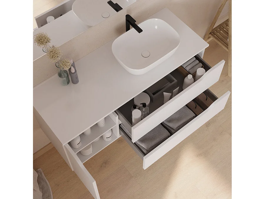 Meuble de salle de bain 120cm avec plateau, vasque à poser déportée à droite Zeus et miroir - 2 tiroirs et un placard - blanc - ZARZA