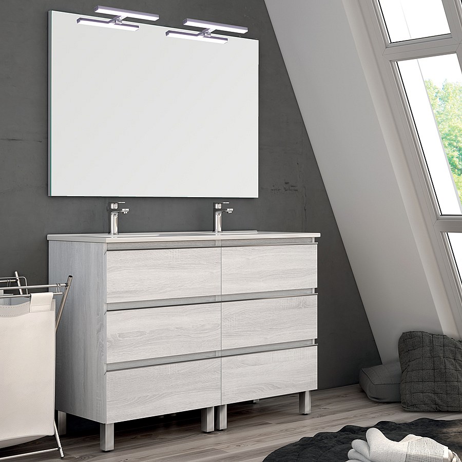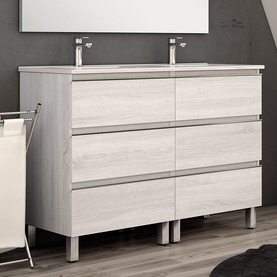 Meuble de salle de bain 120cm double vasque - 6 tiroirs - PALMA - hibernian (bois blanchi)