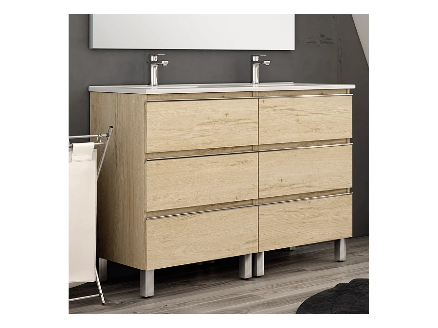 Meuble de salle de bain 120cm double vasque - 6 tiroirs - sans miroir - PALMA - bambou (chêne clair)