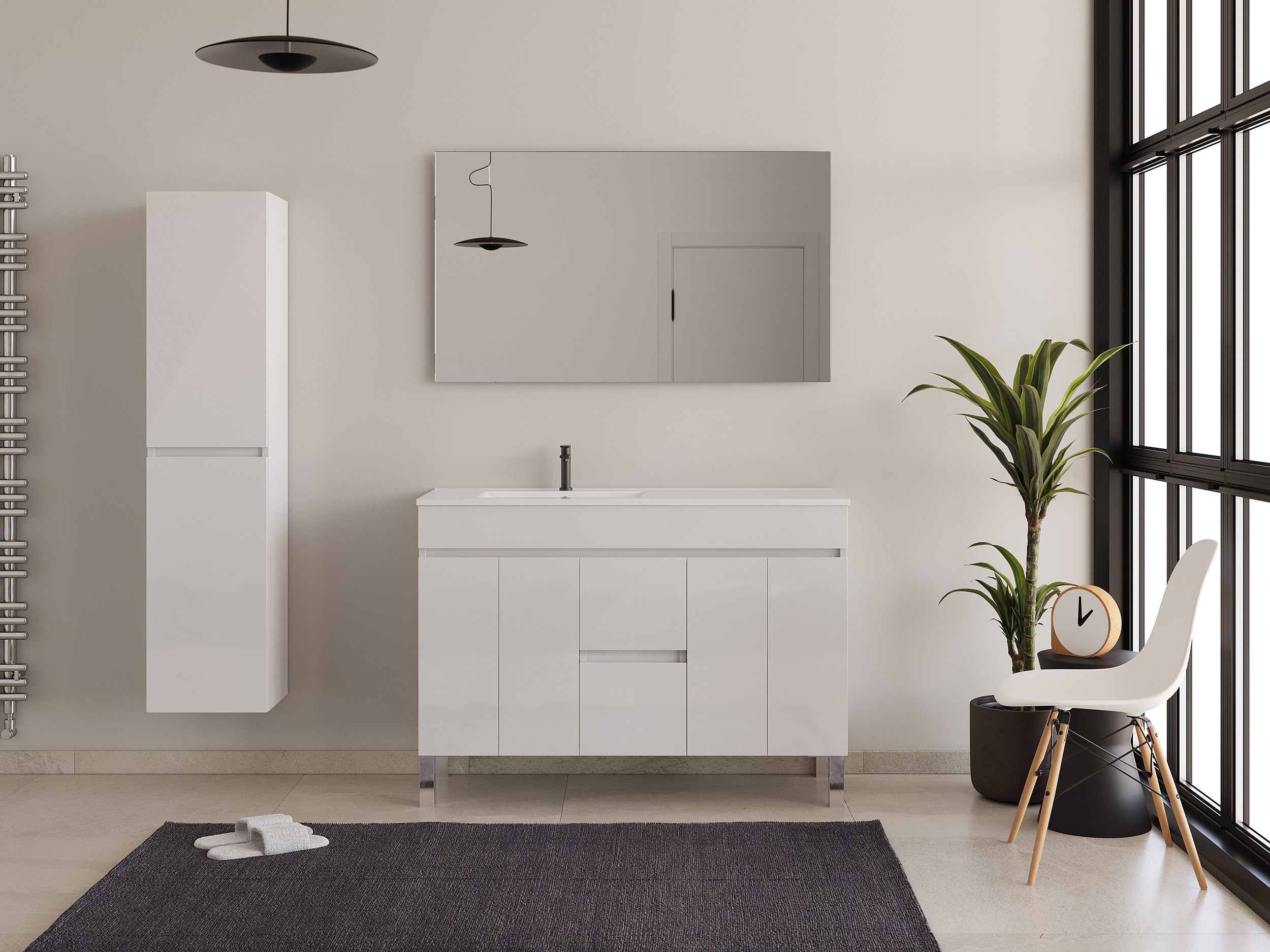 Meuble de salle de bain 120cm sur pieds avec vasque déporté - sans miroir - portes et tiroirs - blanc - HARO