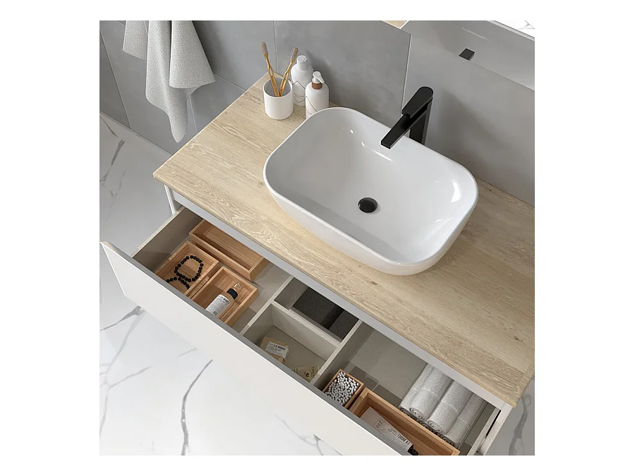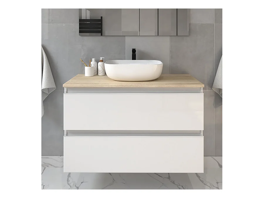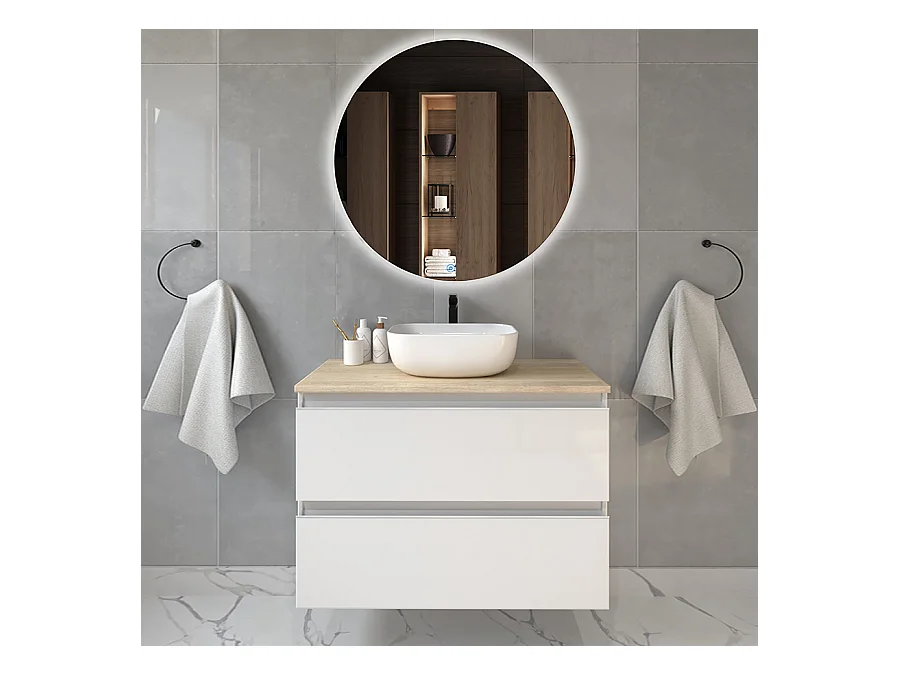 Meuble de salle de bain 2 tiroirs avec vasque à poser arrondie BALEA et miroir rond Led SOLEN - Blanc - 80cm