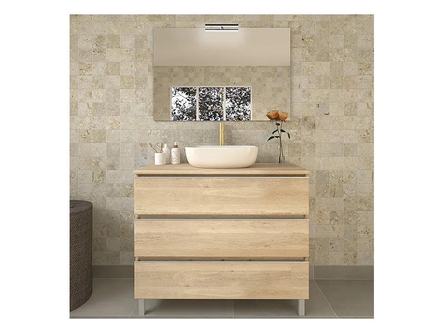 Meuble de salle de bain 3 tiroirs avec vasque à poser arrondie et miroir avec applique PALMA - Bambou (chêne clair) - 100cm