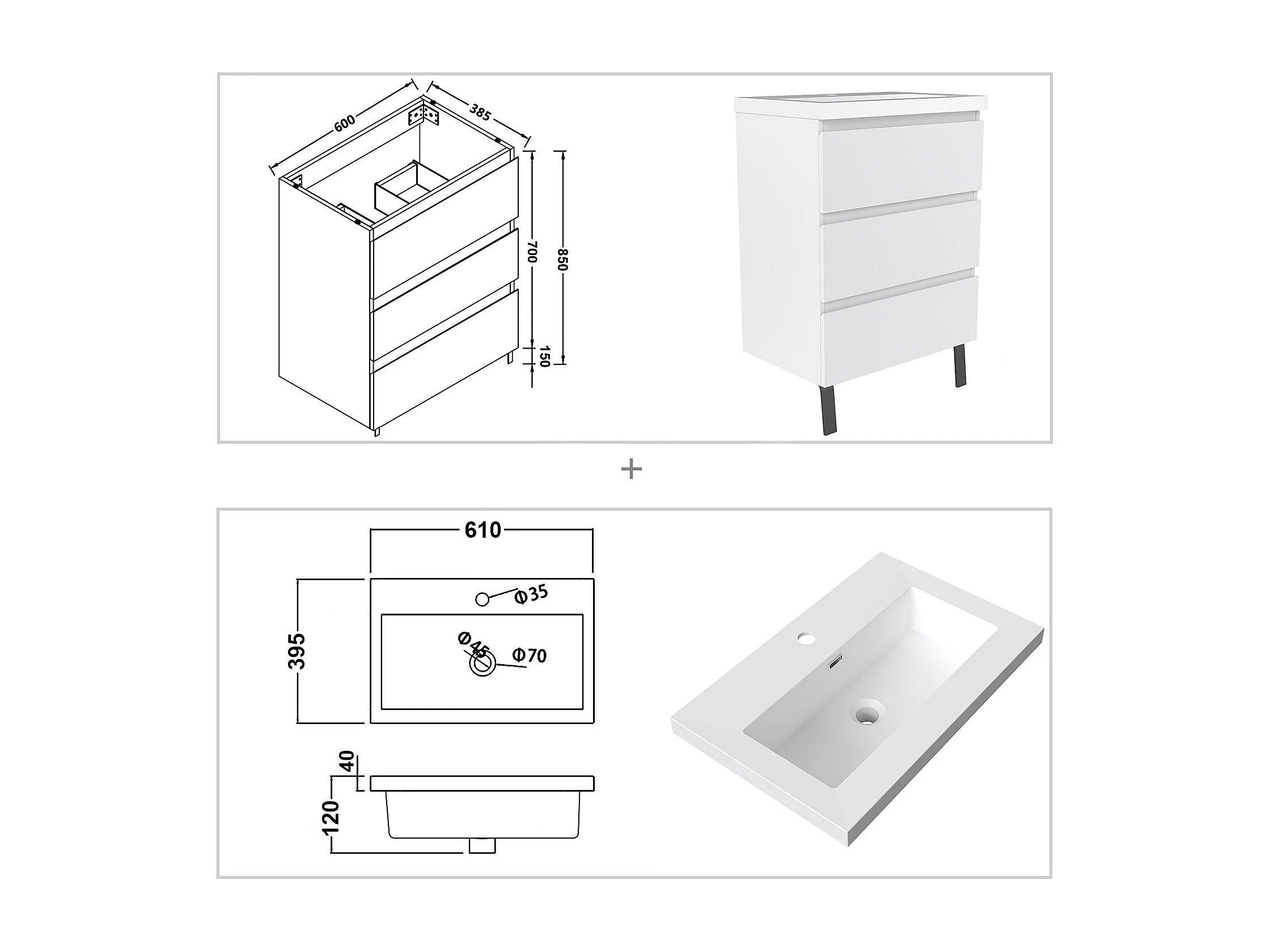 Meuble de Salle de Bain 60cm avec 3 tiroirs + 2 Pieds, Meuble simple vasque, Blanc