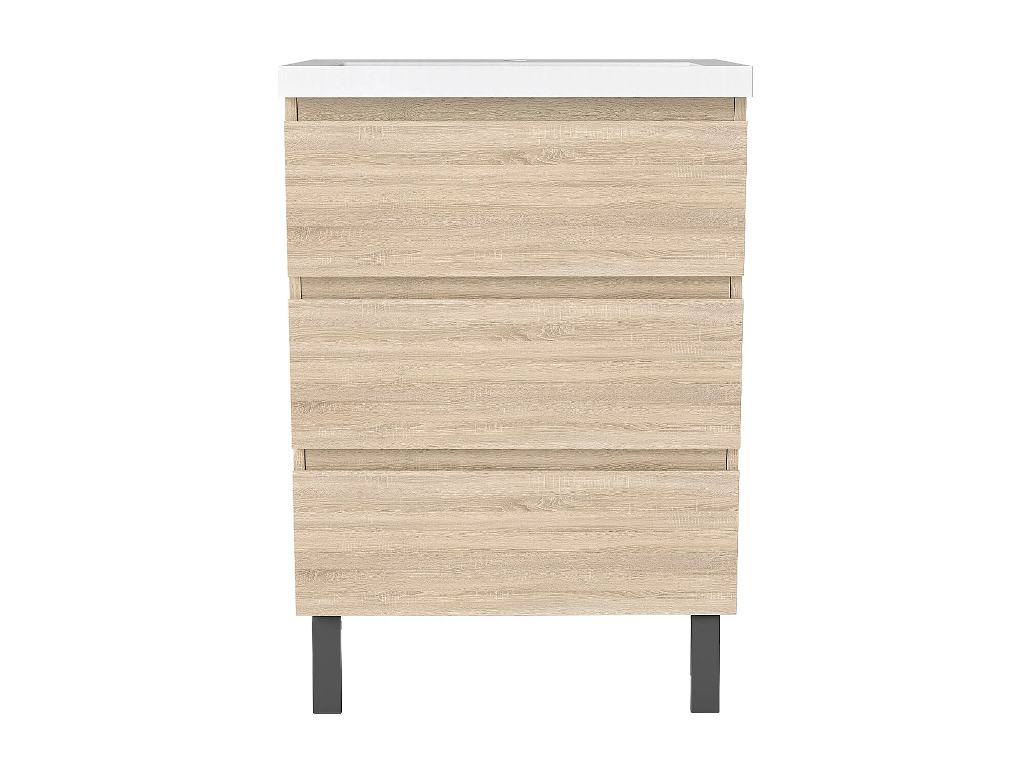 Meuble de Salle de Bain 60cm avec 3 tiroirs + 2 Pieds, Meuble simple vasque céramique, Chêne