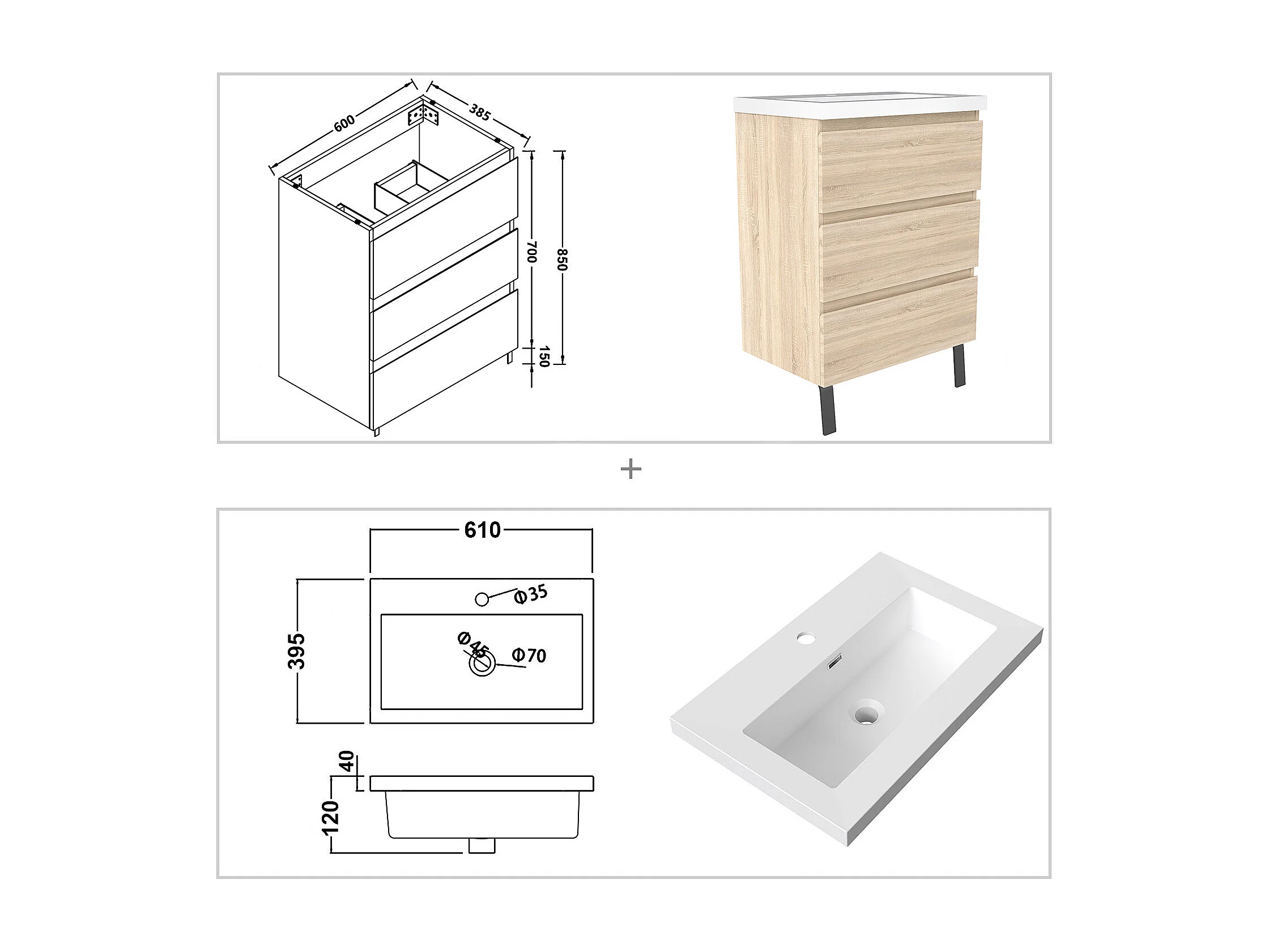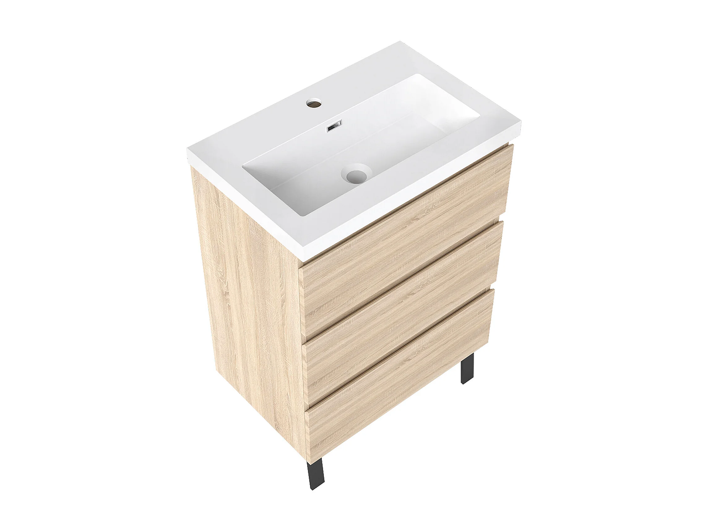 Meuble de Salle de Bain 60cm avec 3 tiroirs + 2 Pieds, Meuble simple vasque, Chêne