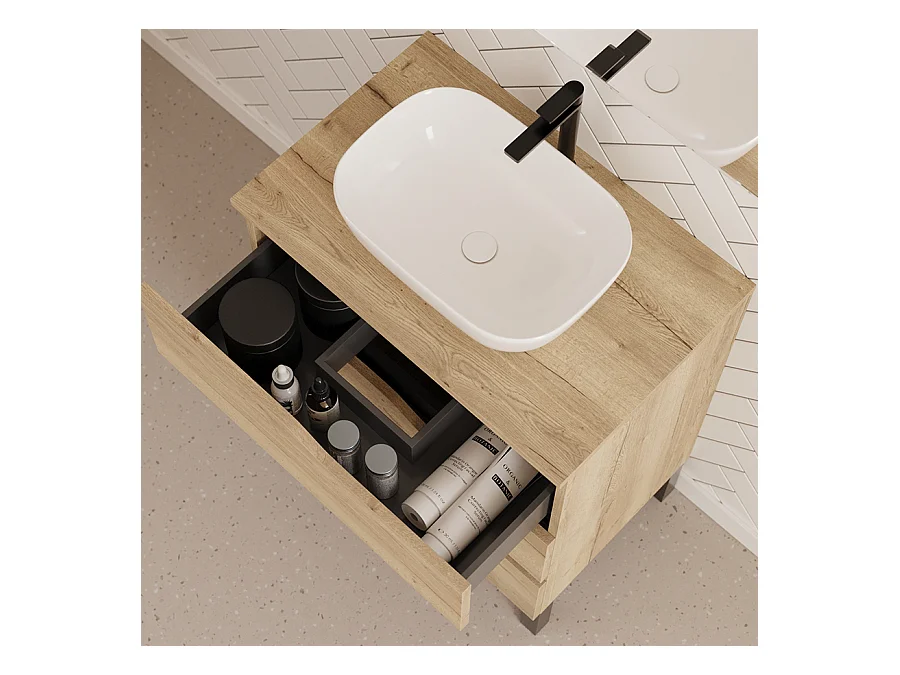 Meuble de salle de bain 60cm avec plateau et vasque à poser zeus - 3 tiroirs - madera miel (chêne clair) - MATA