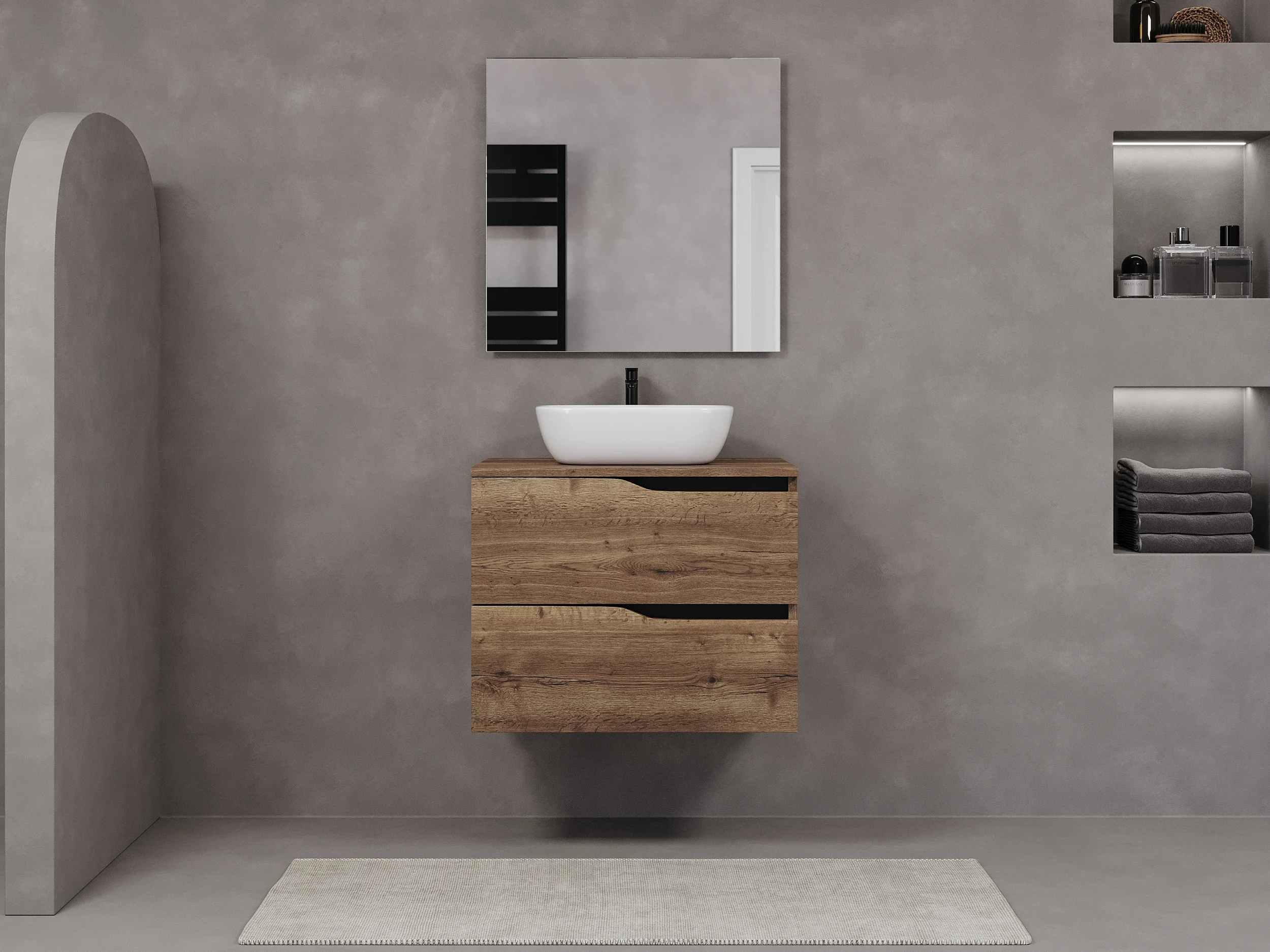 Meuble de salle de bain 70cm avec plateau et vasque à poser zeus - 2 tiroirs - sans miroir - tabaco (chêne foncé) - LUNA