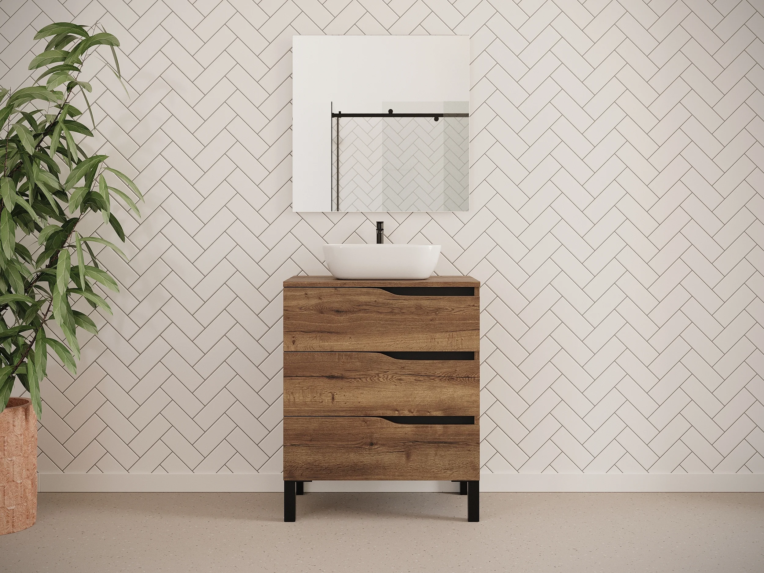 Meuble de salle de bain 70cm avec plateau et vasque à poser zeus - 3 tiroirs - sans miroir - tabaco (chêne foncé) - MATA