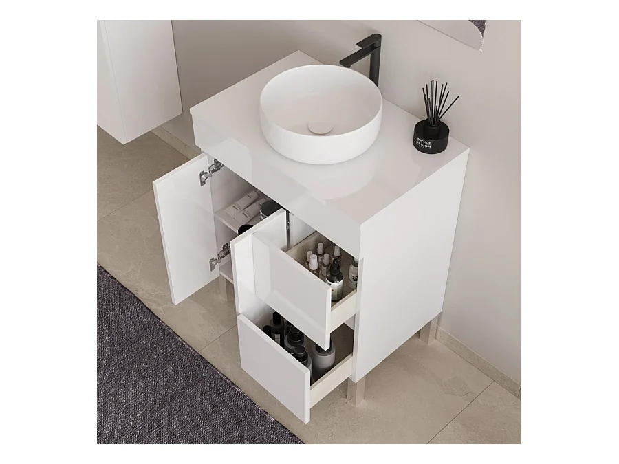 Meuble de salle de bain 70cm sur pieds avec plateau et une cuve à poser ronde - sans miroir - portes et tiroirs - blanc - HARO