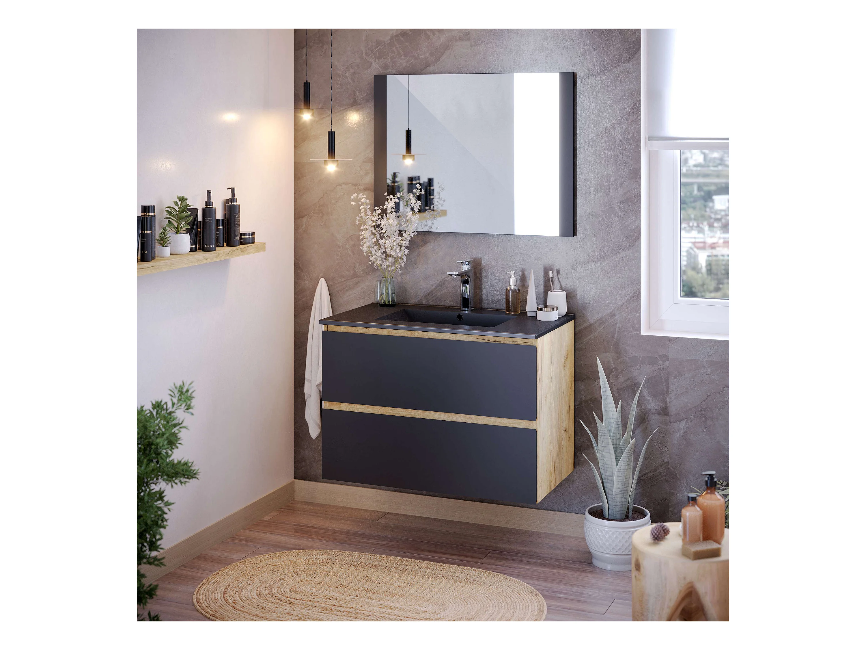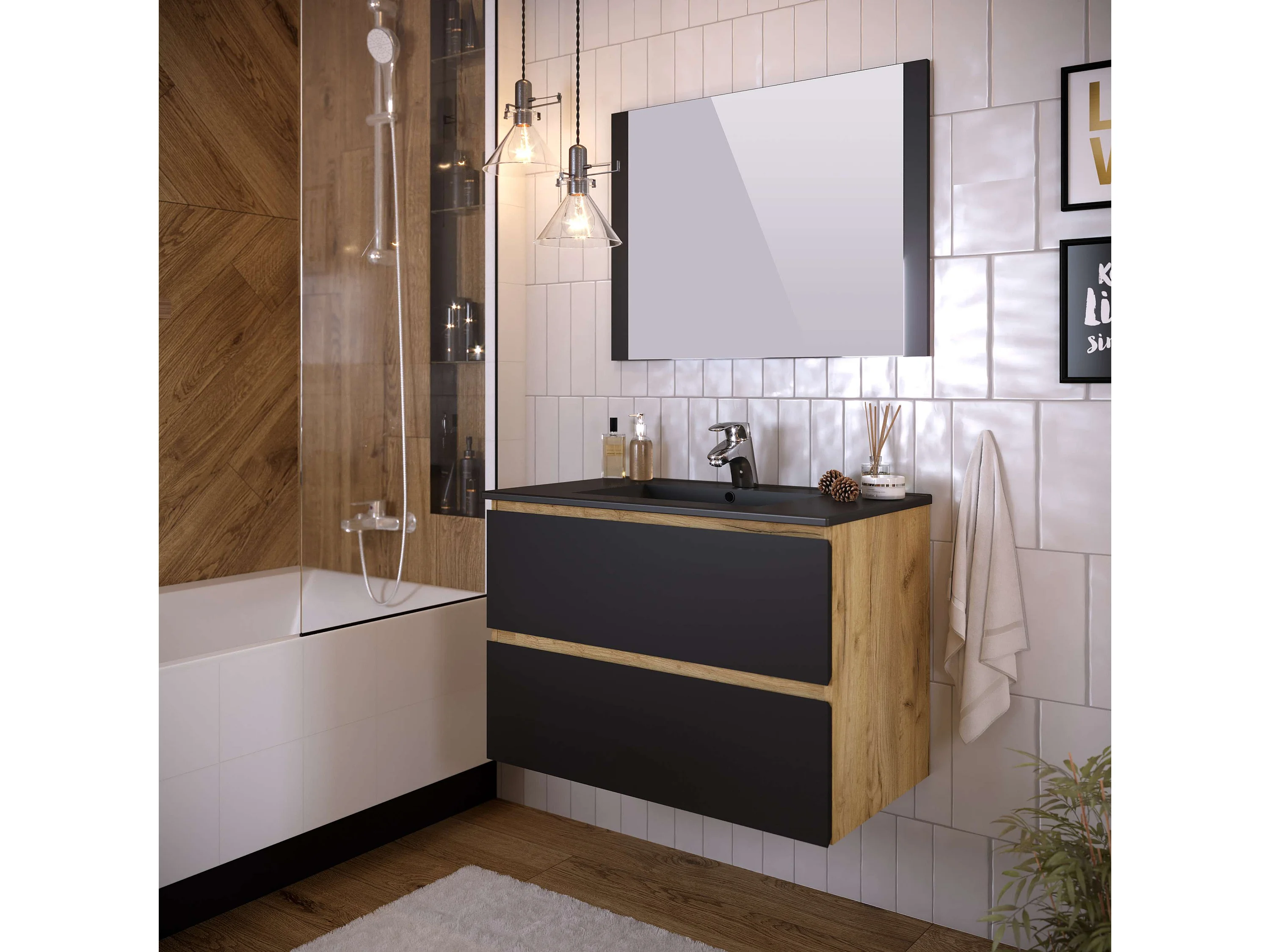 Meuble de salle de bain NELI 2 tiroirs 80 cm chêne et noir T-BATH Inclus lavabo, miroir et applique LED