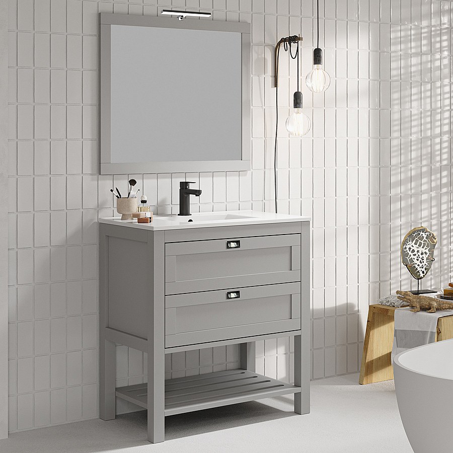 Meuble de salle de bain 80 cm simple vasque - pin massif - 2 tiroirs - PYLA - gris