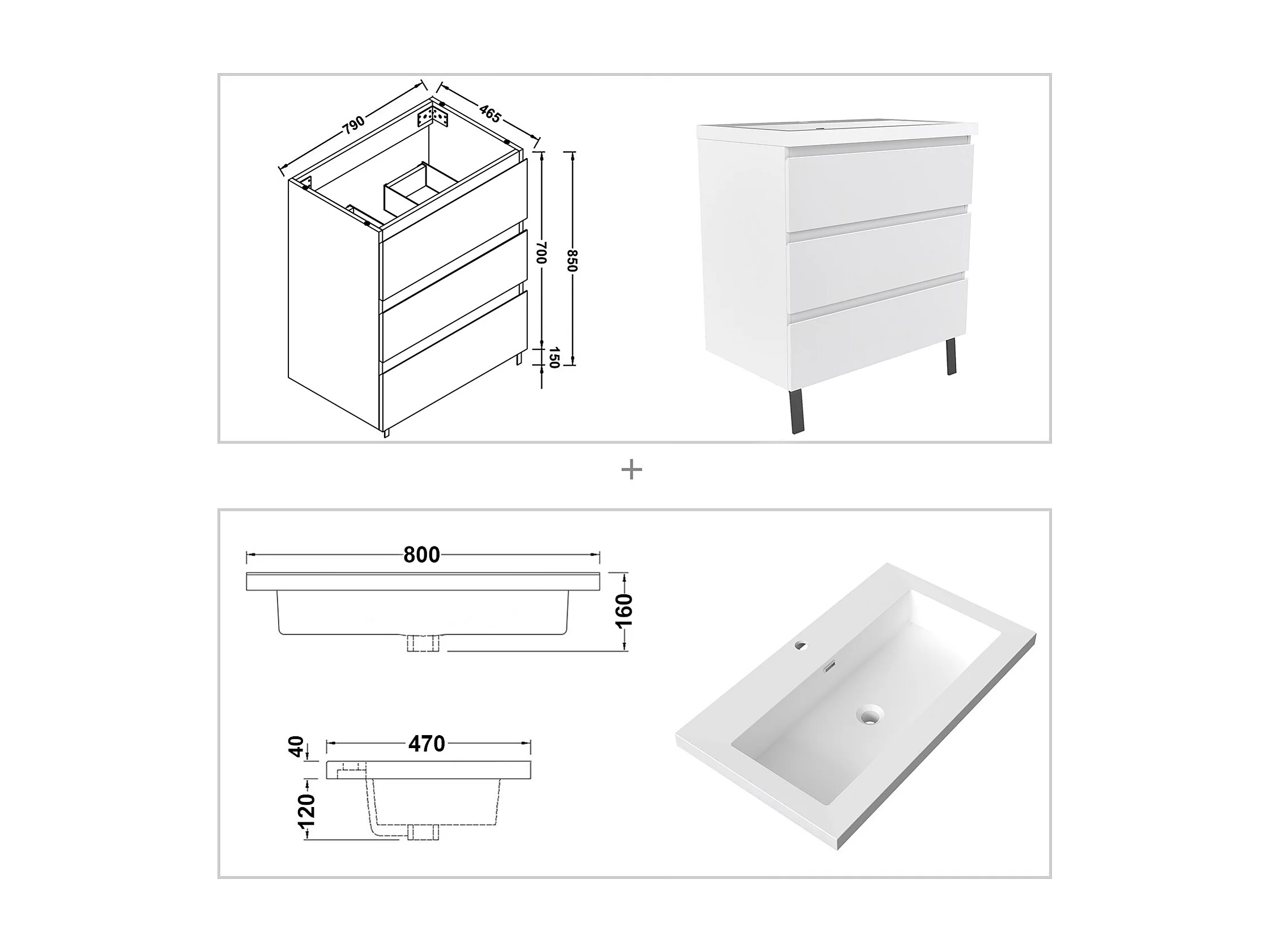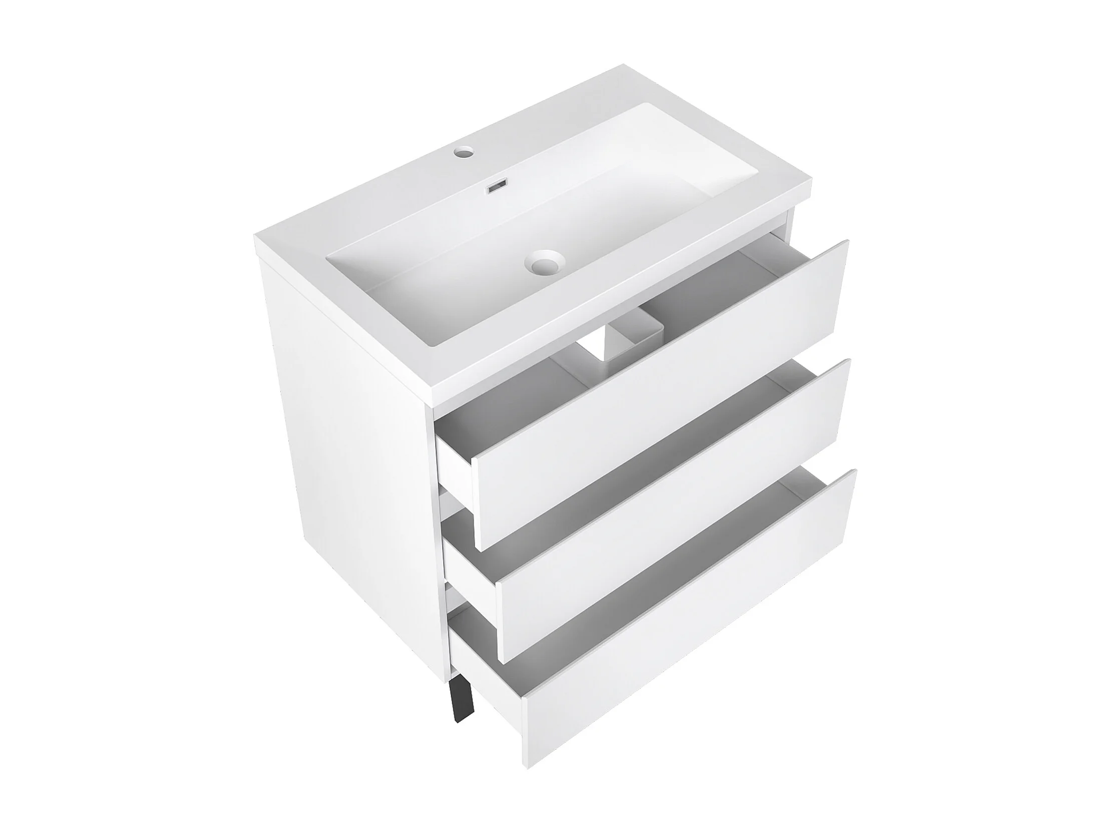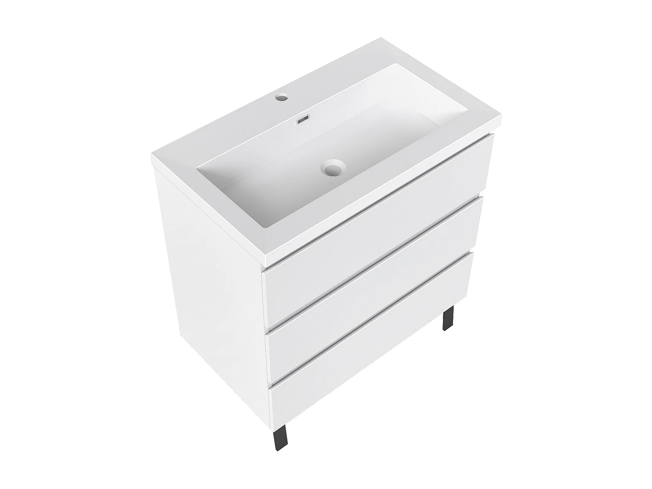 Meuble de Salle de Bain 80cm avec 3 tiroirs + 2 Pieds, Meuble simple vasque, Blanc