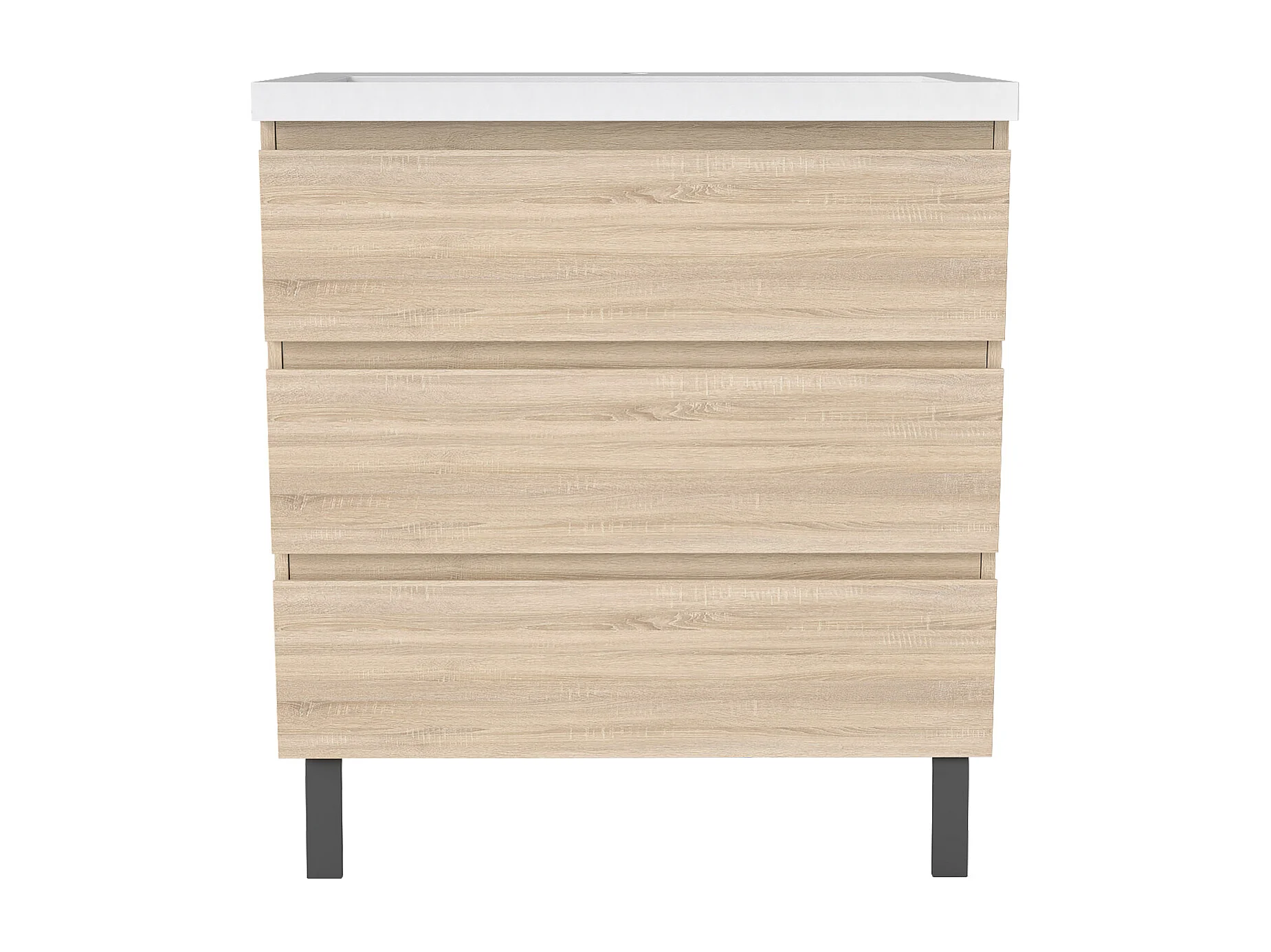 Meuble de Salle de Bain 80cm avec 3 tiroirs + 2 Pieds, Meuble simple vasque céramique, Chêne