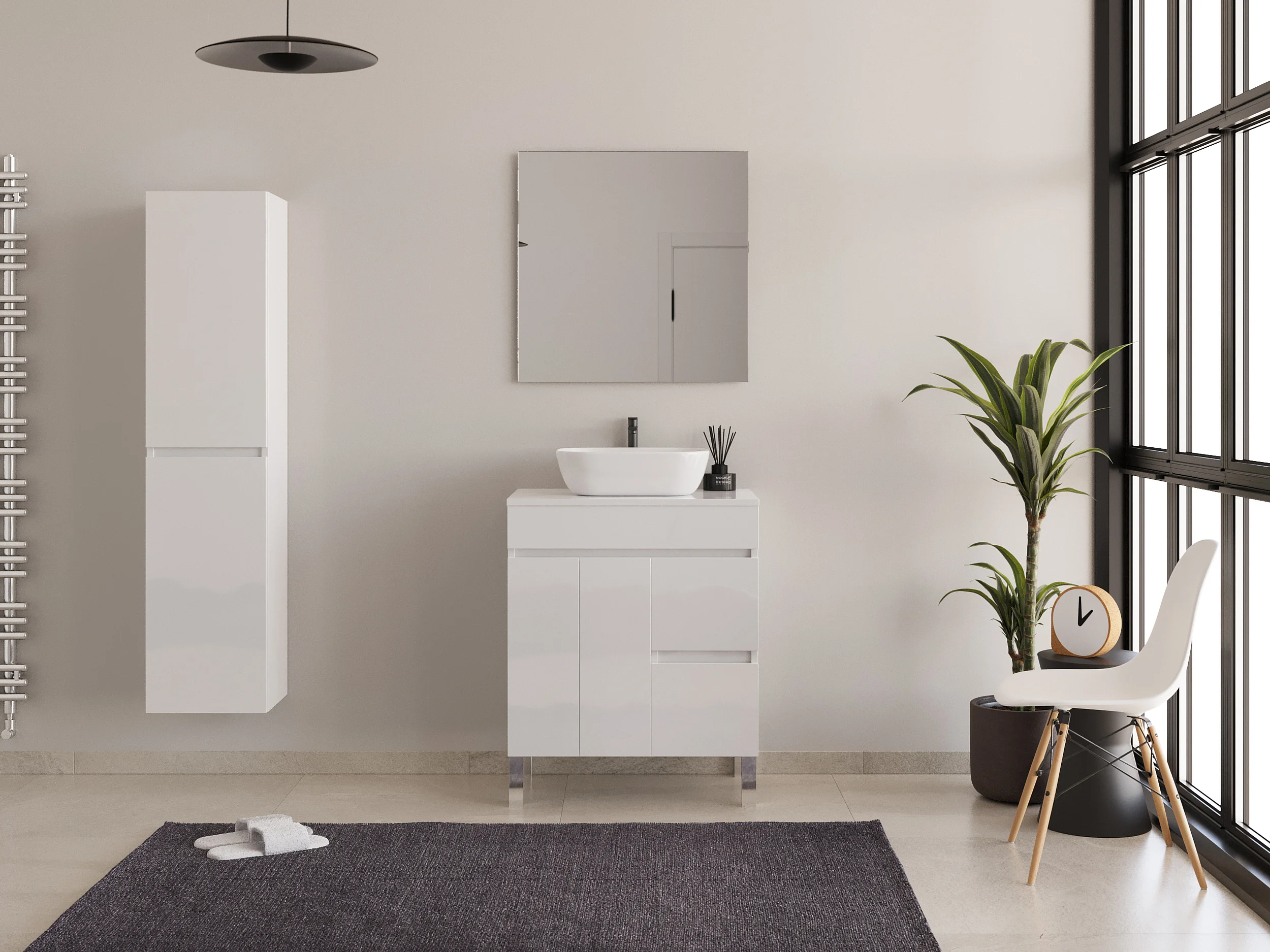 Meuble de salle de bain 80cm sur pieds avec plateau et une cuve à poser arrondie - sans miroir - portes et tiroirs - blanc - HARO