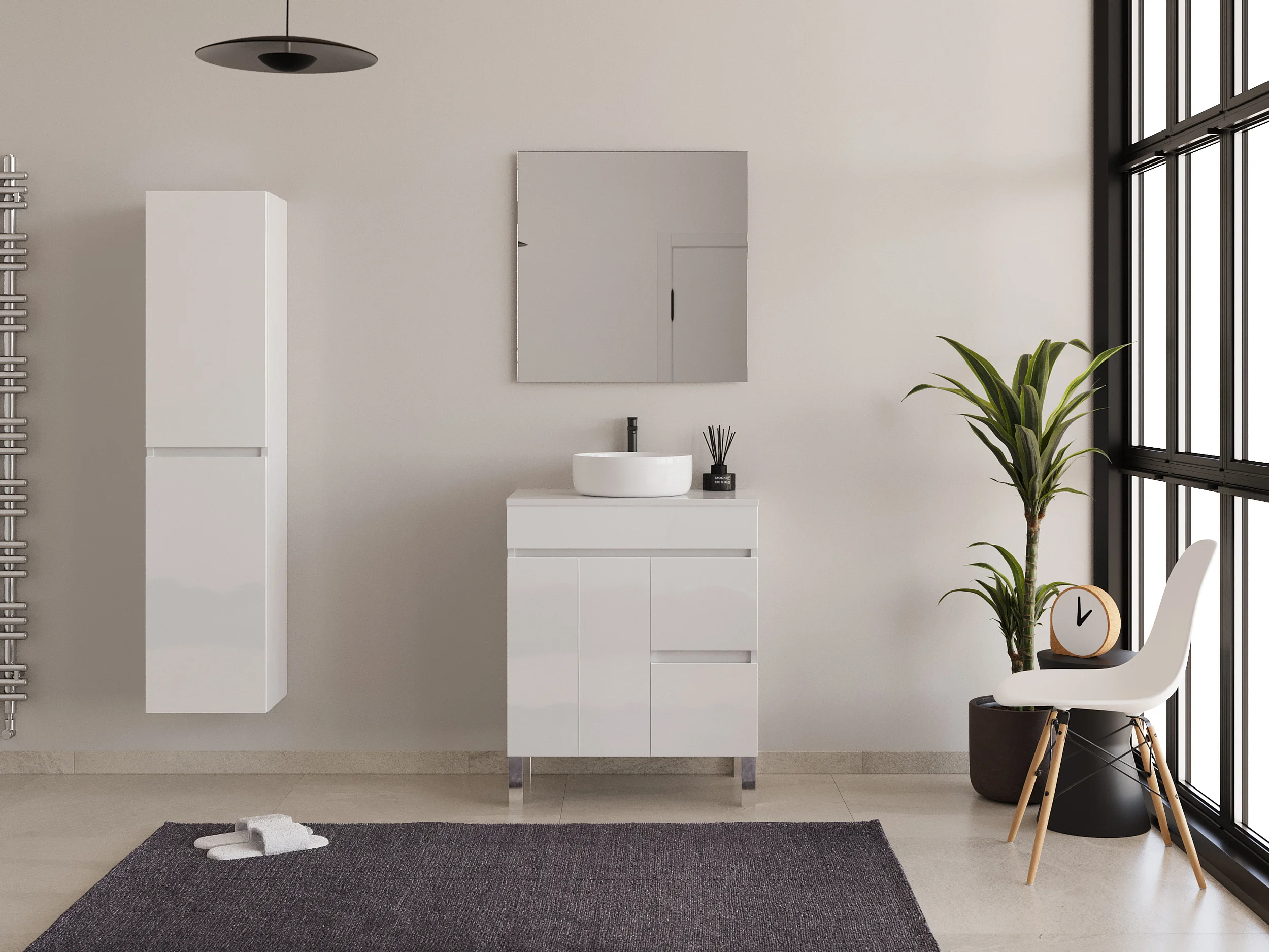 Meuble de salle de bain 80cm sur pieds avec plateau et une cuve à poser ronde - sans miroir - portes et tiroirs - blanc - HARO