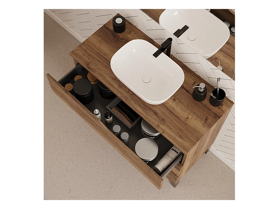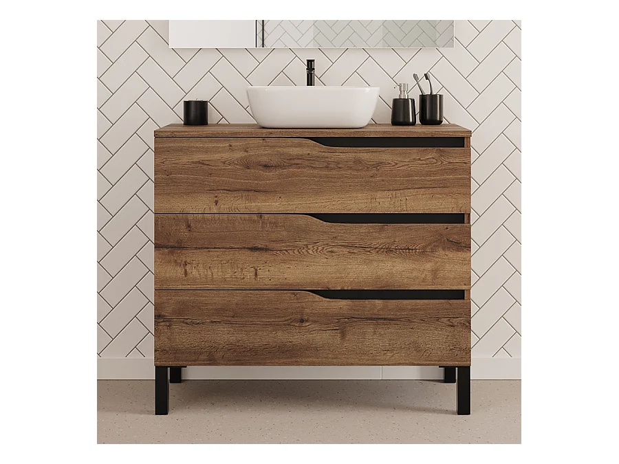 Meuble de salle de bain 90cm avec plateau et vasque à poser zeus - 3 tiroirs - sans miroir - tabaco (chêne foncé) - MATA