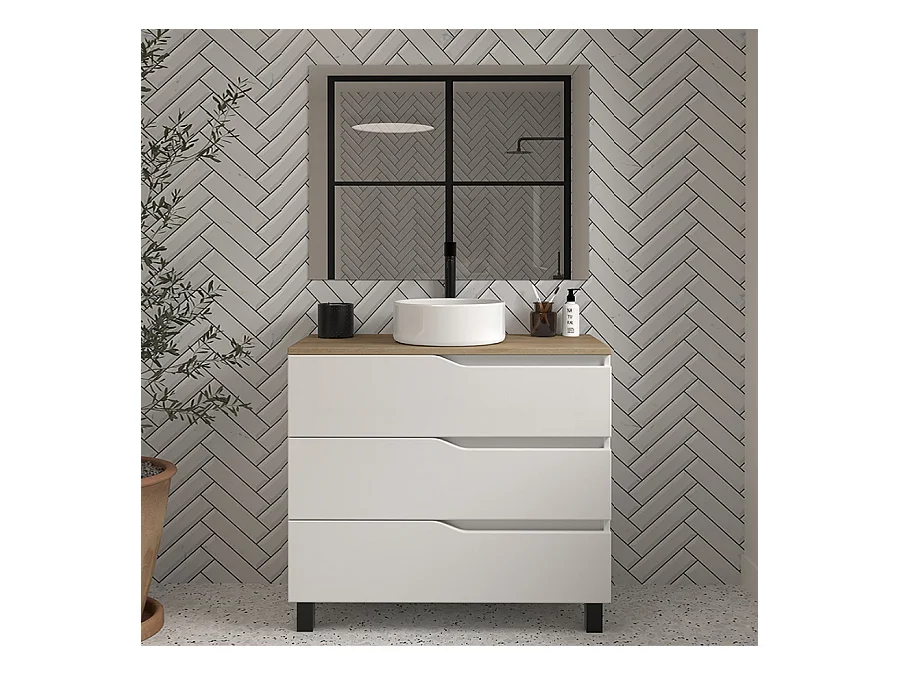 Meuble de salle de bain 90cm avec plateau miel et vasque à poser - 3 tiroirs - blanc - MATA