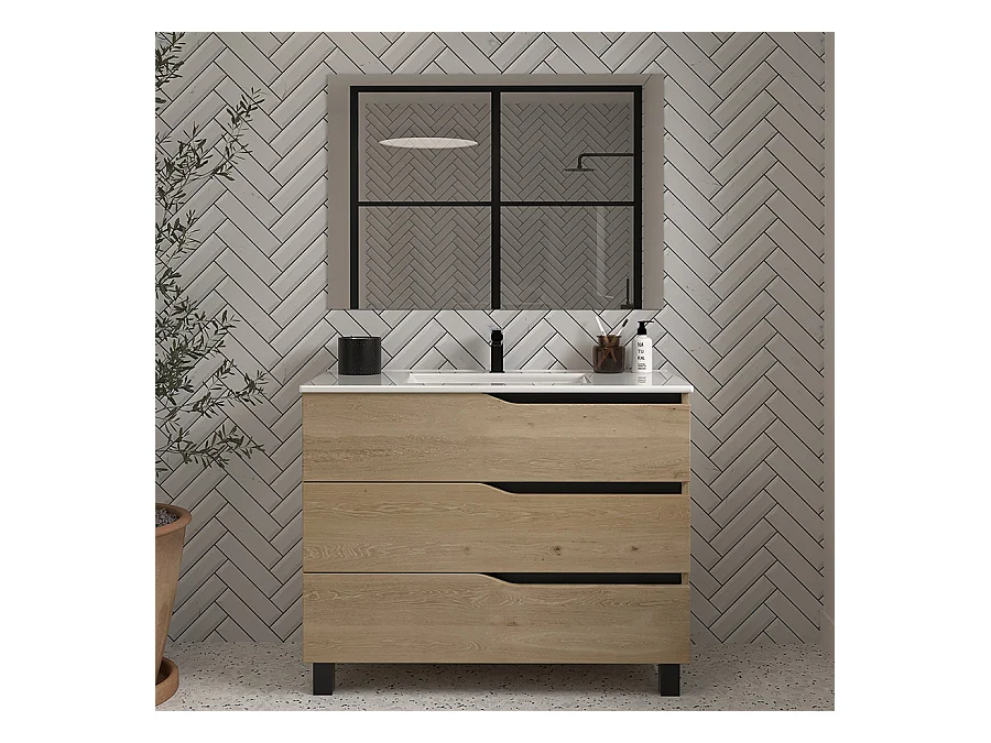 Meuble de salle de bain 90cm simple vasque - 3 tiroirs - madera miel (chêne clair) - MATA