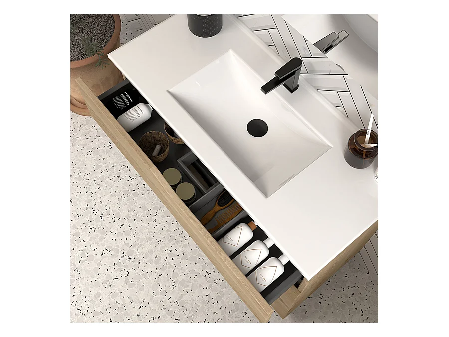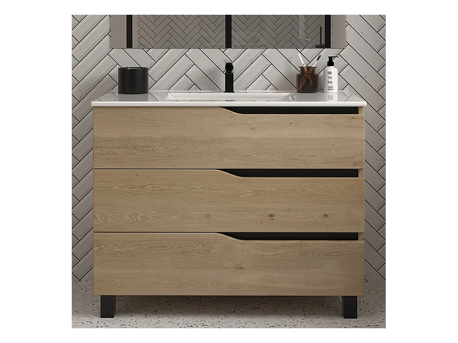 Meuble de salle de bain 90cm simple vasque - 3 tiroirs - sans miroir - madera miel (chêne clair) - MATA