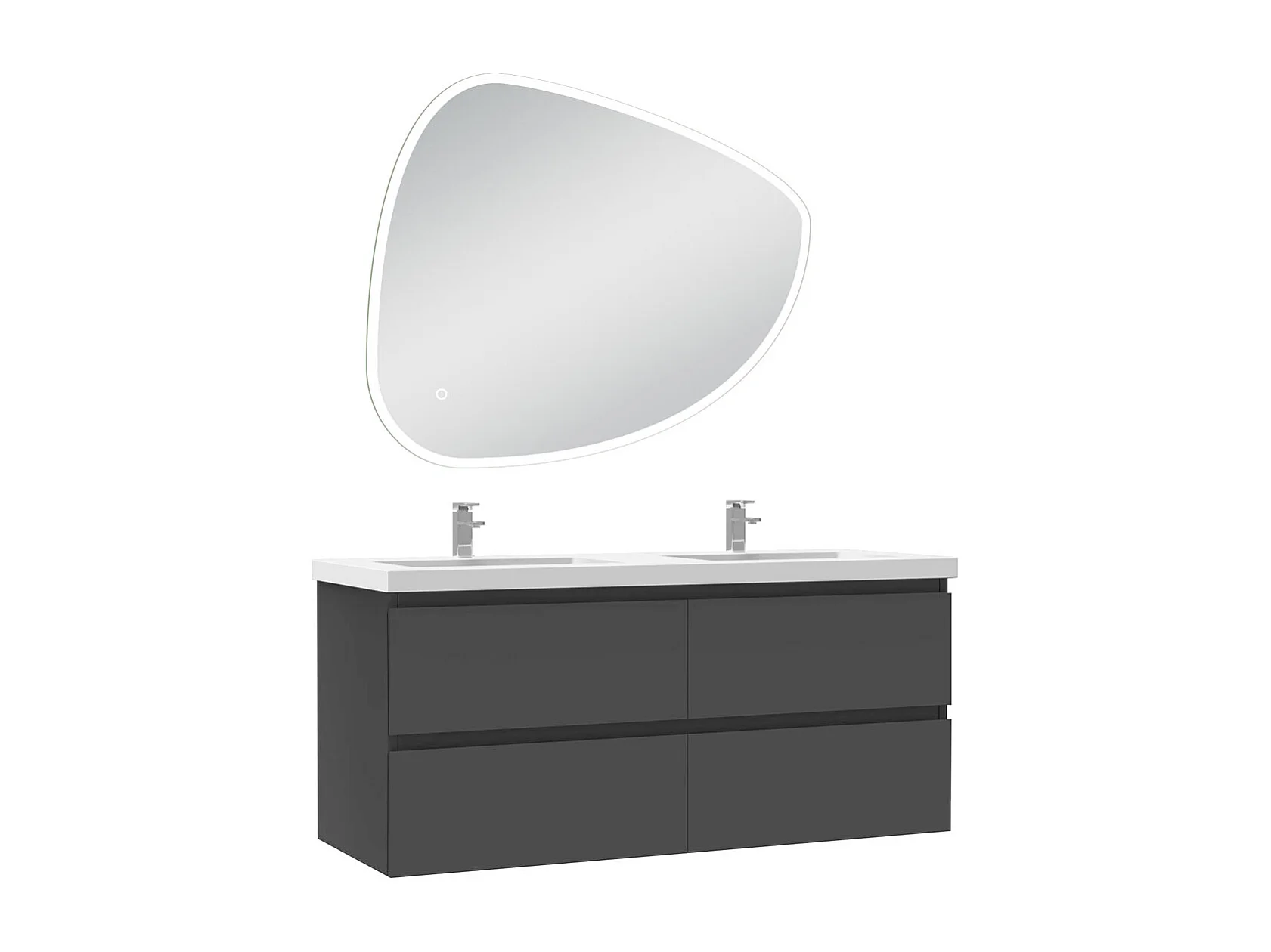 Meuble de salle de bain à 4 tiroirs L.120cm + lavabo + miroir antibuée Asymétrique à led 100x80cm, anthracite suspendu