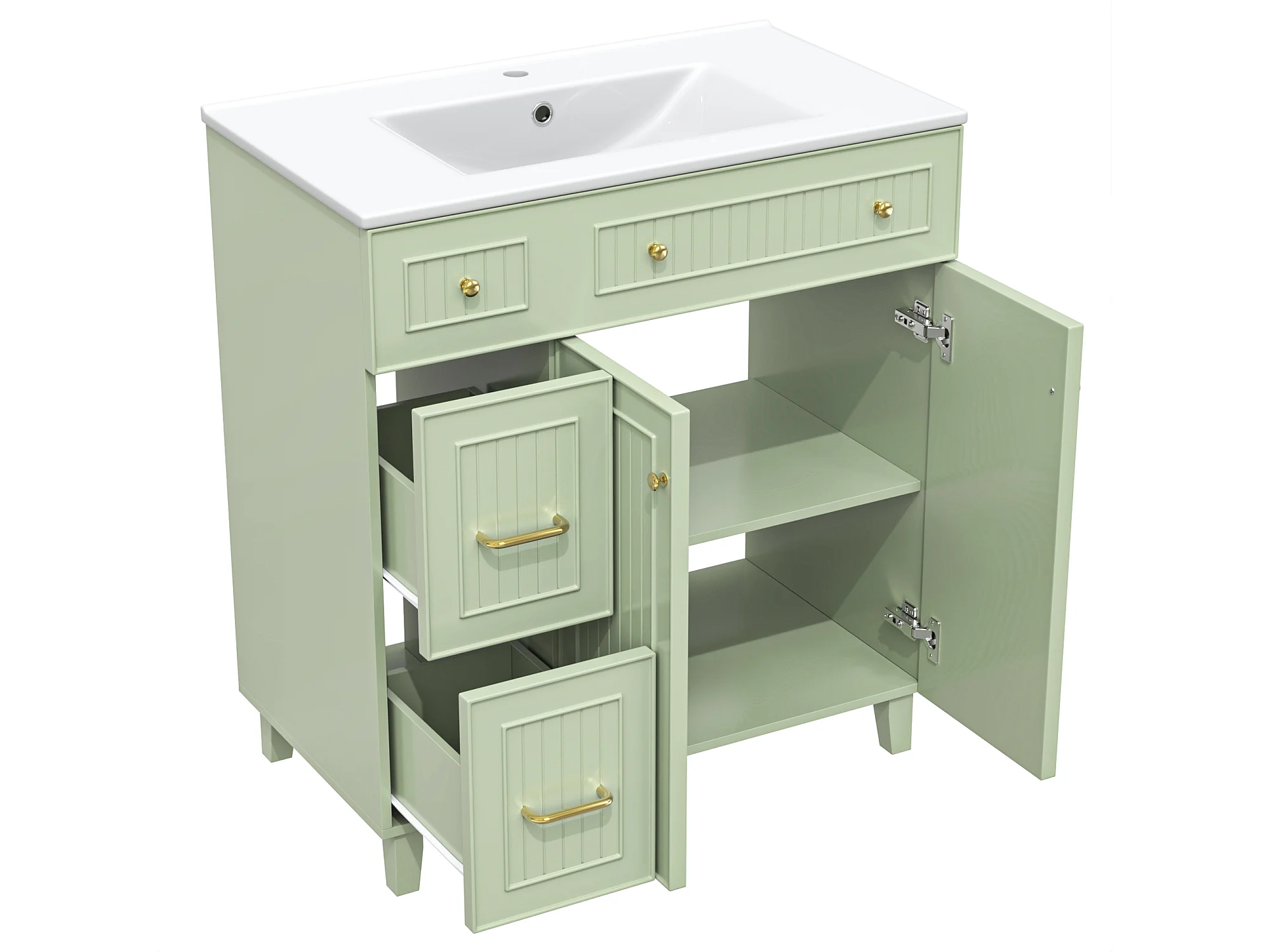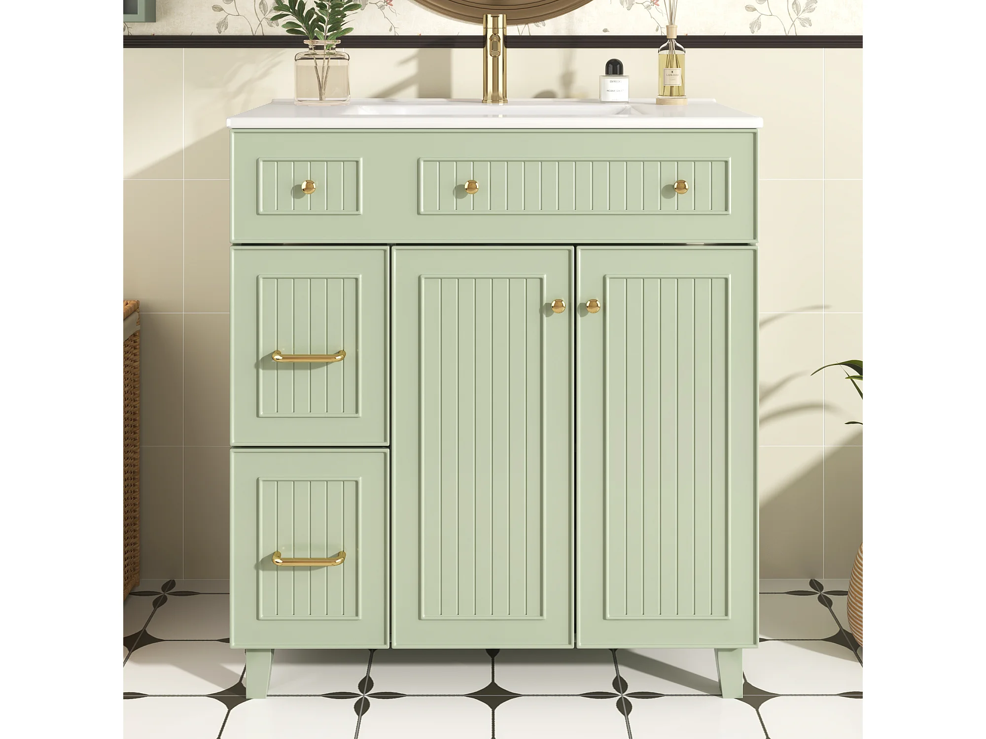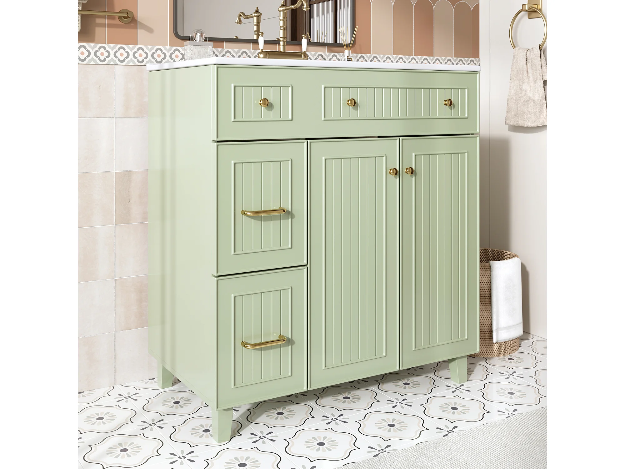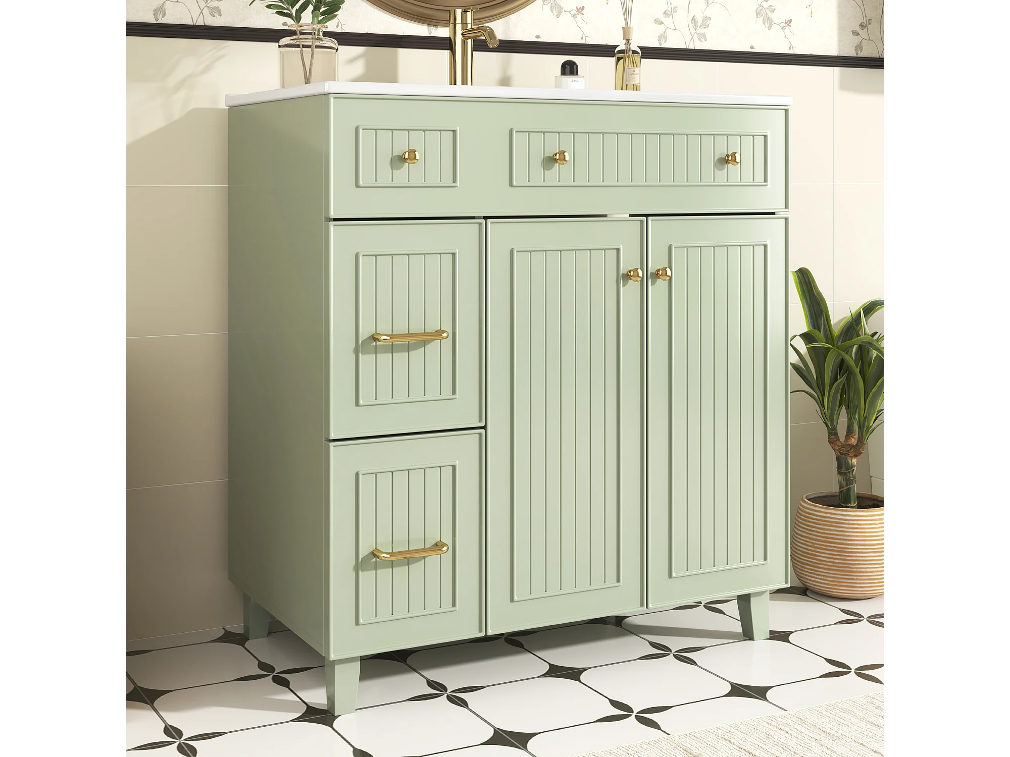 Meuble de salle de bain avec une vasque en céramique - avec 2 portes et 2 tiroirs - vert (robinet non inclus)