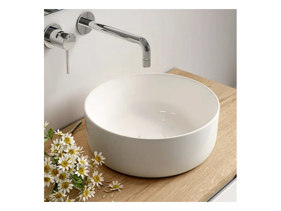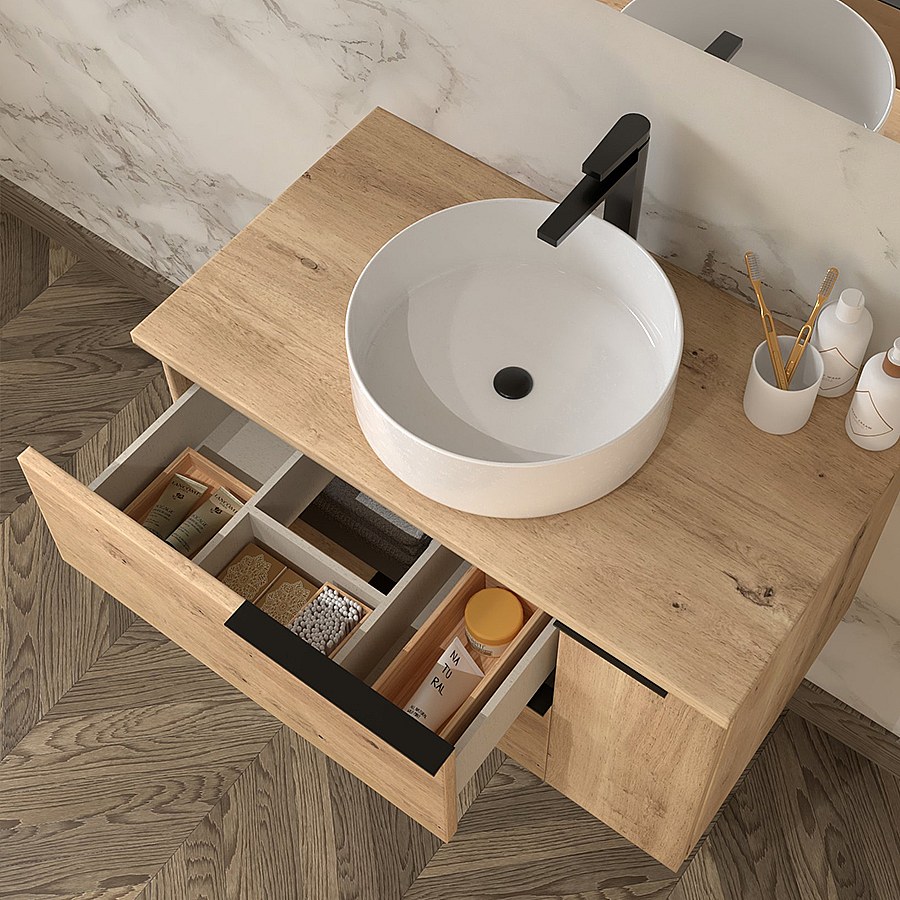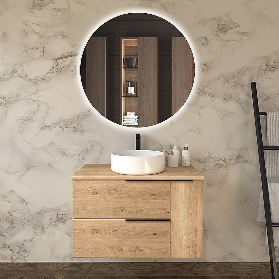 Meuble de salle de bain avec vasque à poser ronde KING et miroir rond SOLEN - Roble (chêne clair) - 80cm