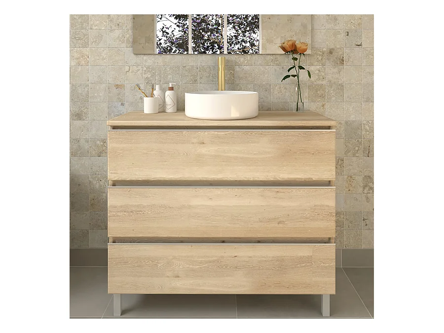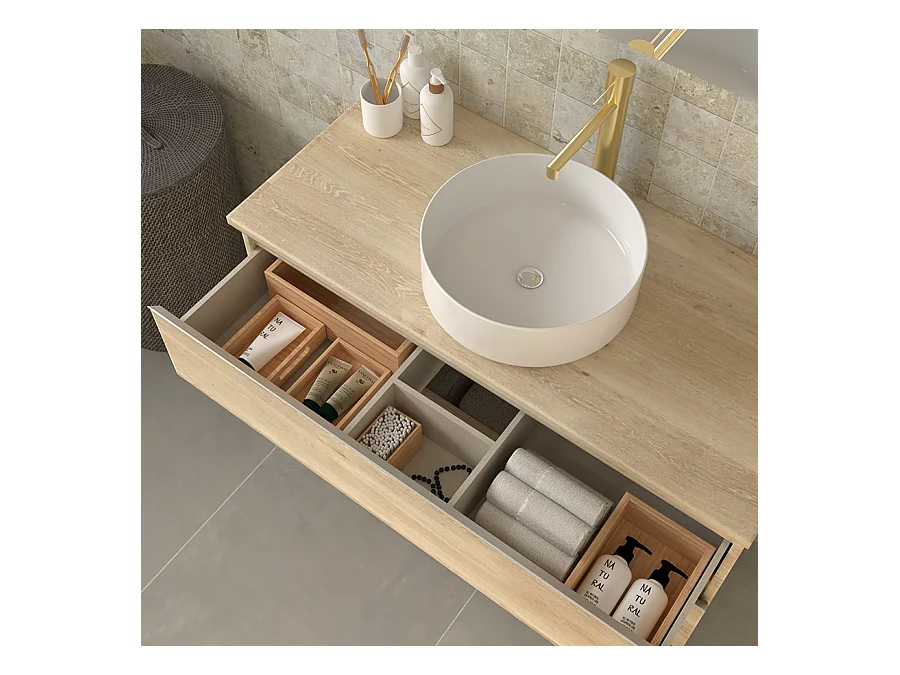 Meuble de salle de bain avec vasque à poser ronde PALMA et miroir Led STAM - Bambou (chêne clair) - 70cm