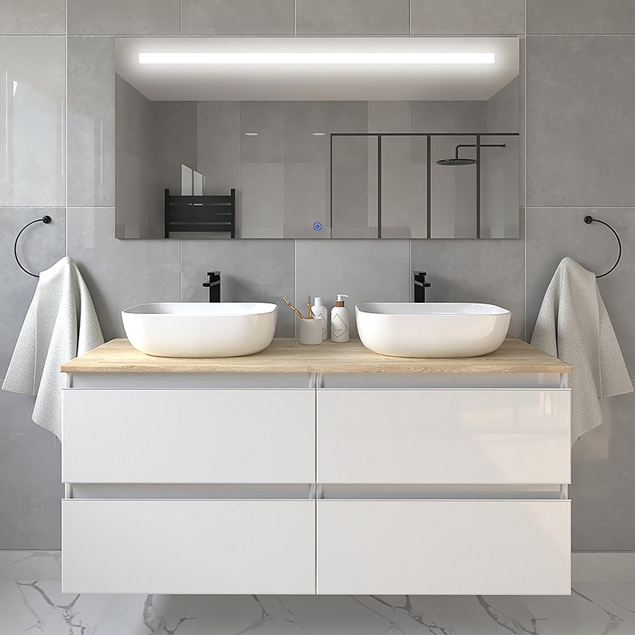 Meuble de salle de bain avec vasques à bords arrondies BALEA et miroir Led STAM - Blanc - 120cm