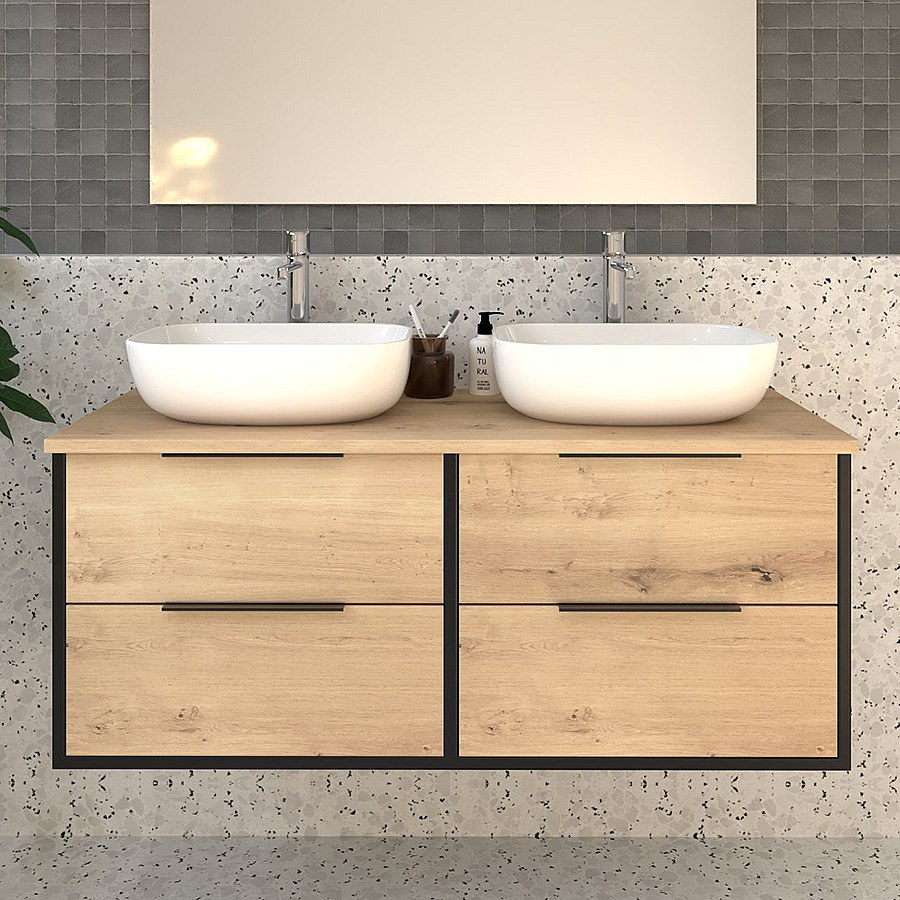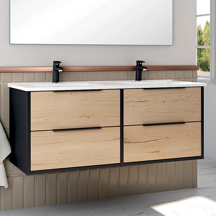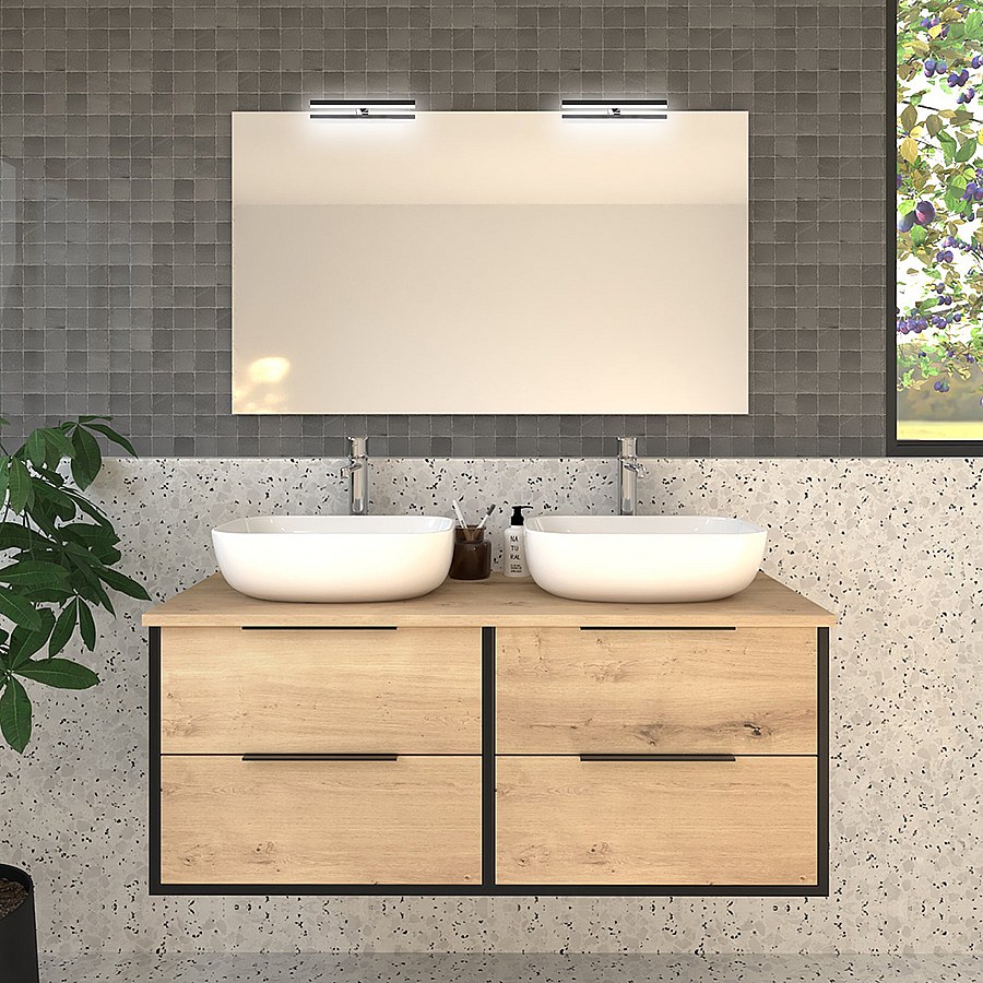 Meuble de salle de bain avec vasques à poser arrondies ALBA et miroir avec appliques - Noir - 120cm