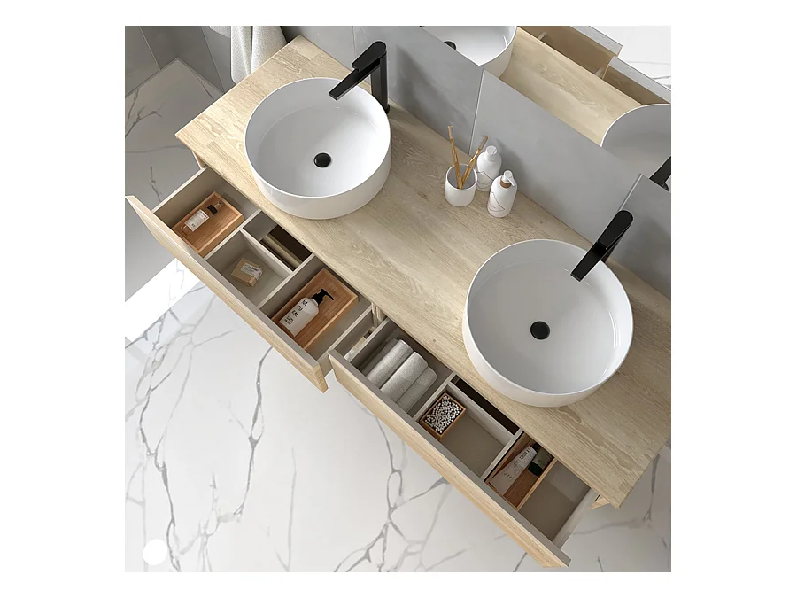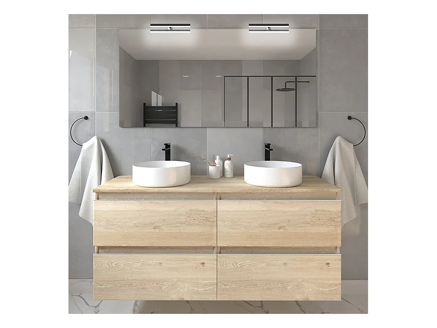 Meuble de salle de bain avec vasques rondes BALEA et miroir avec appliques - Bambou (chêne clair) - 120cm