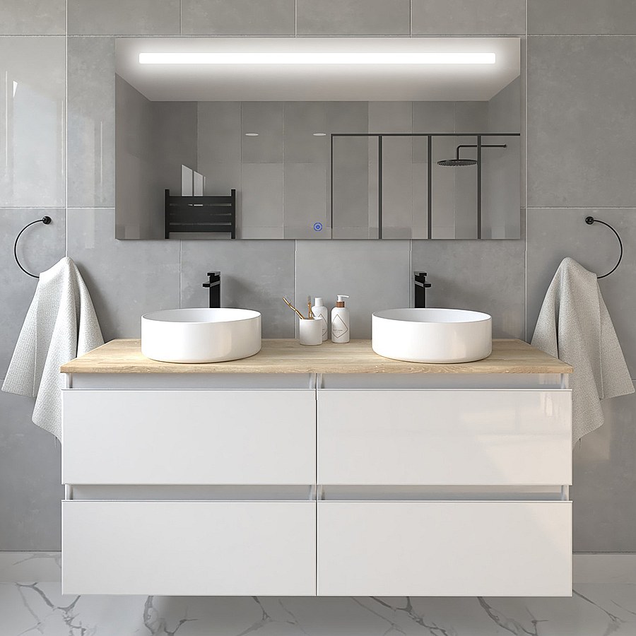 Meuble de salle de bain avec vasques rondes BALEA et miroir Led STAM - Blanc - 120cm