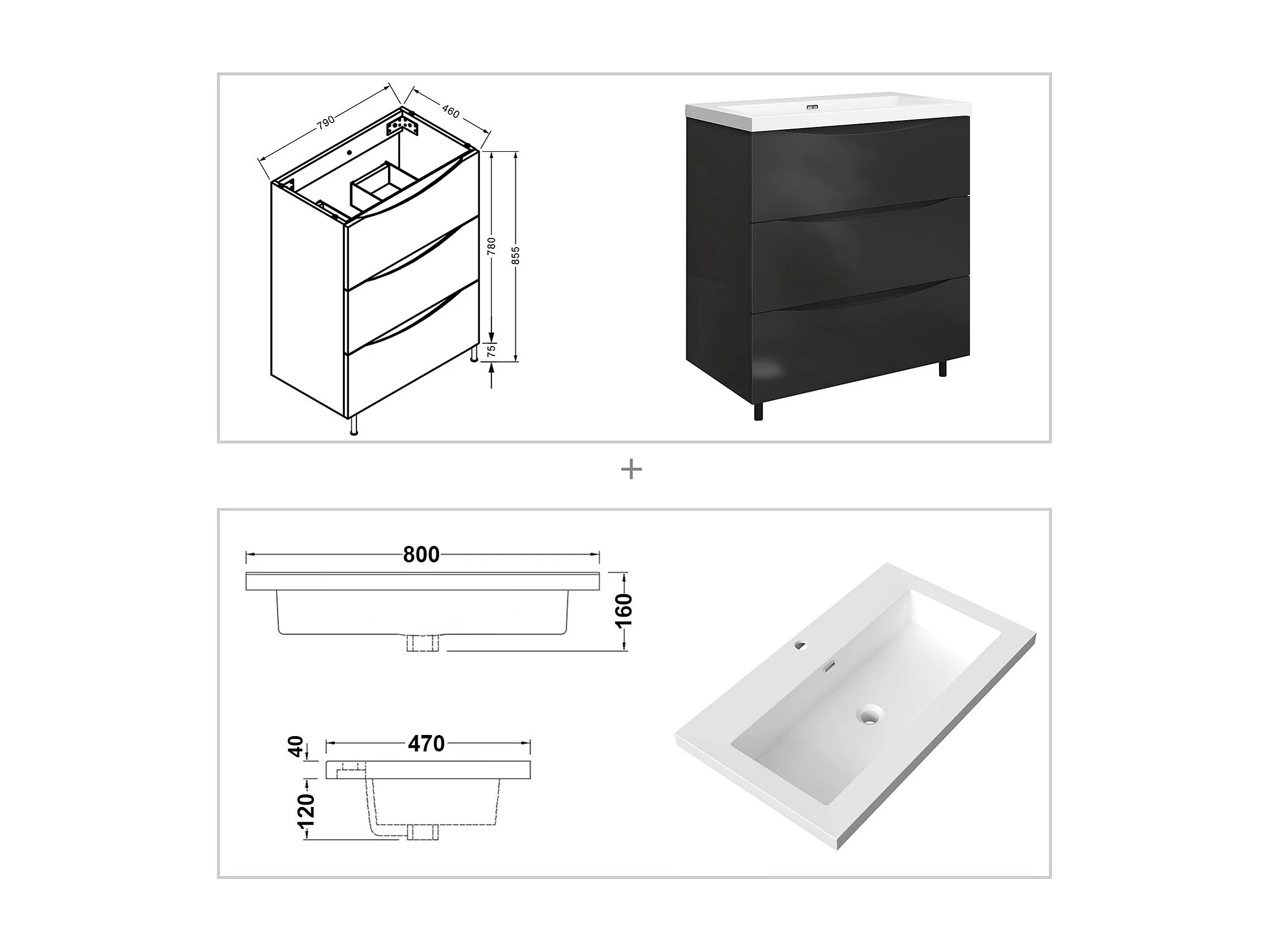 Meuble de salle de bain Brillant, Meuble de sol 80cm avec simple lavabo + 3 tiroirs, Anthracite