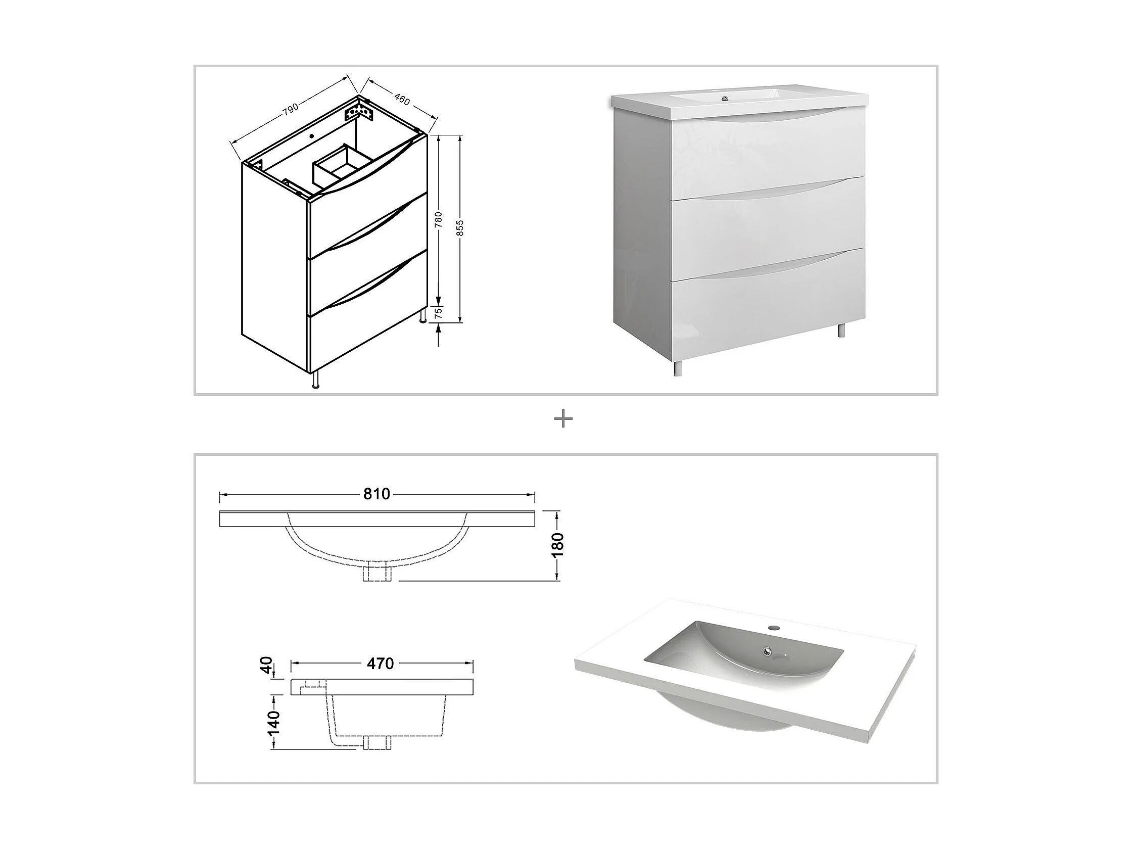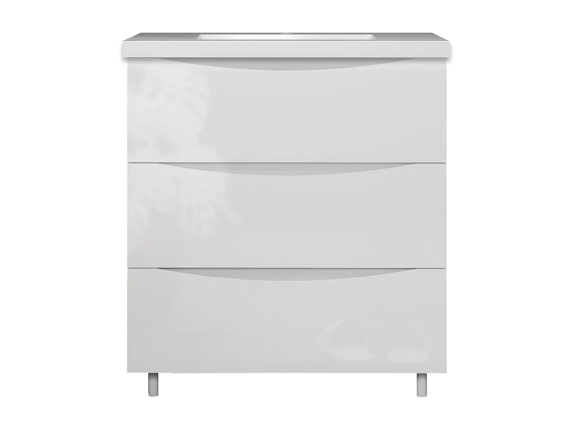 Meuble de salle de bain Brillant, Meuble de sol 80cm avec simple vasque + 3 tiroirs, Blanc