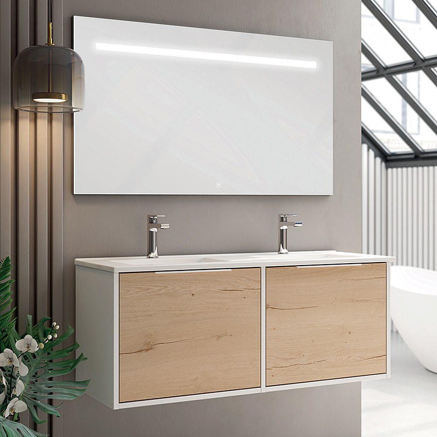 Meuble de salle de bain double vasque - 2 façades et 4 tiroirs - ALBA et miroir Led STAM - blanc-Chêne - 120cm