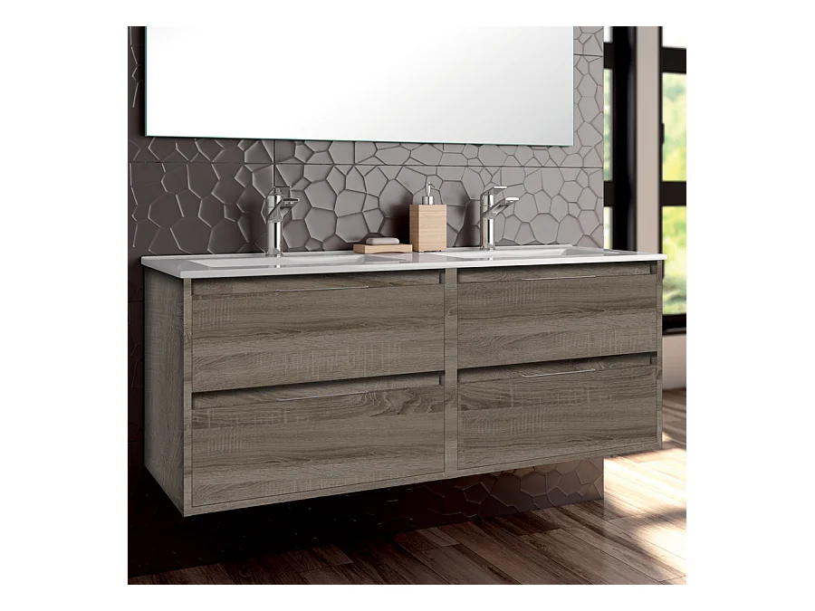Meuble de salle de bain double vasque - 4 tiroirs - IRIS et miroir Led STAM - britannia (chêne foncé) - 120cm