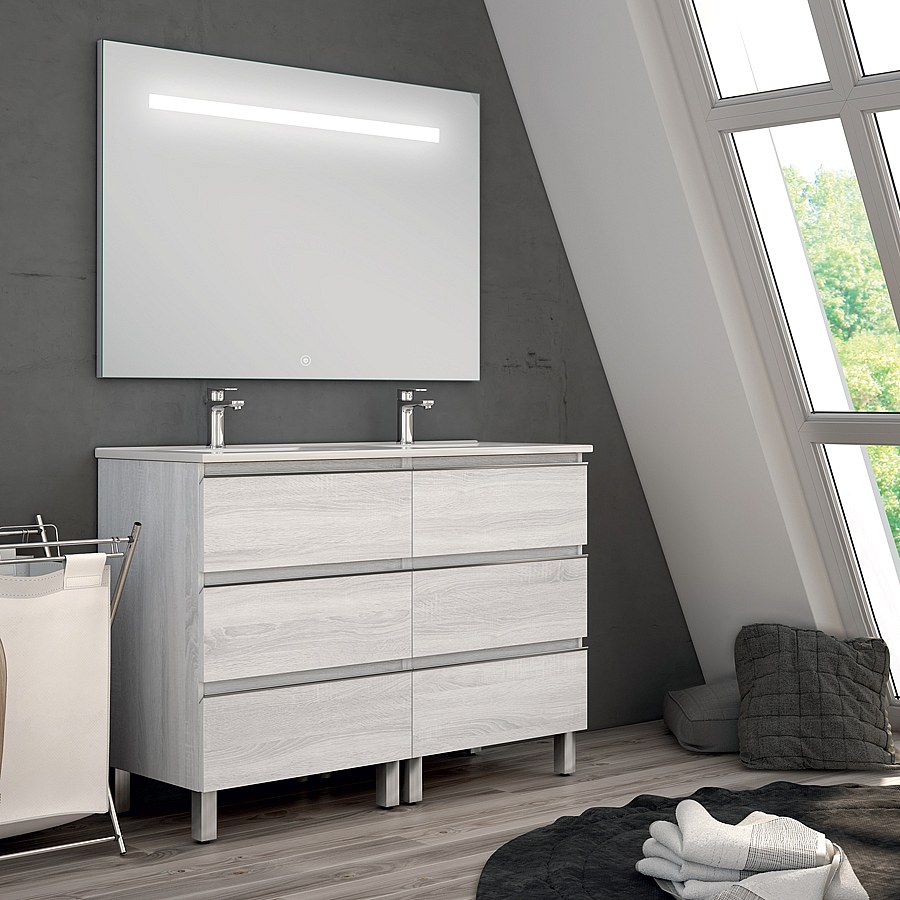 Meuble de salle de bain double vasque - 6 tiroirs - PALMA et miroir Led STAM - hibernian (bois blanchi) - 120cm