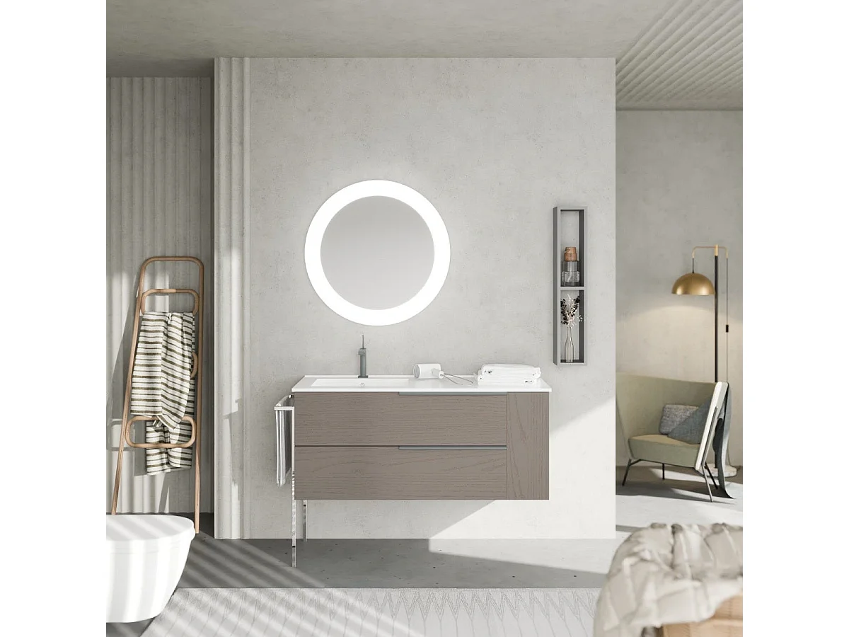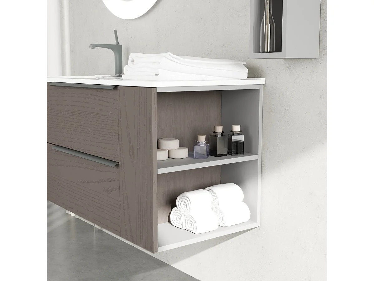 Meuble De Salle De Bain Mural En Frêne Gris De 120 Cm Avec Tiroirs + Compartiment Ouvert | New York