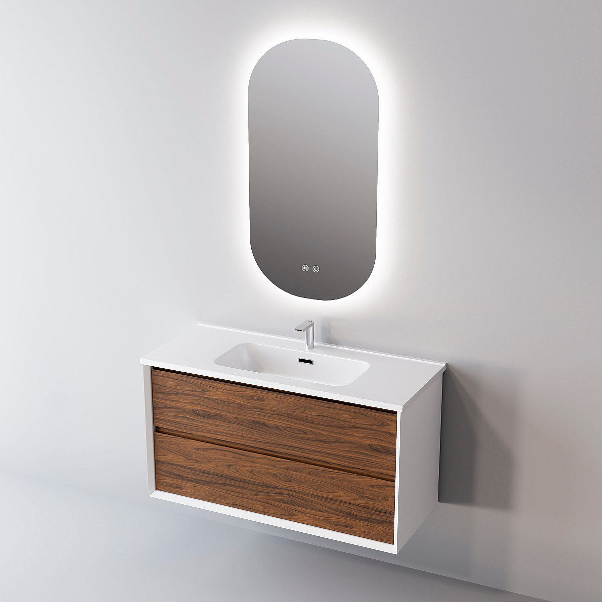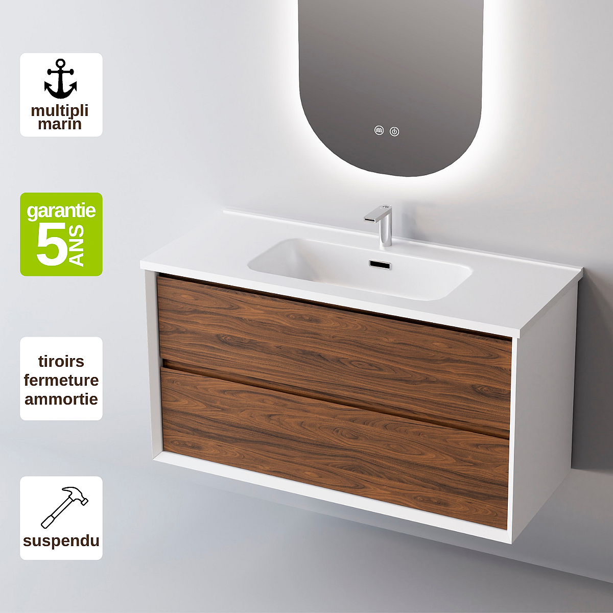 Meuble Salle de Bain COOL (61 cm x H54 x P45 cm), Plan Vasque Céramique WB, 2 Tiroirs, Laqué Blanc Mat/Noyer