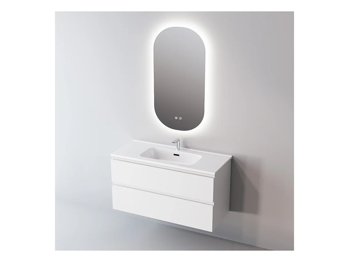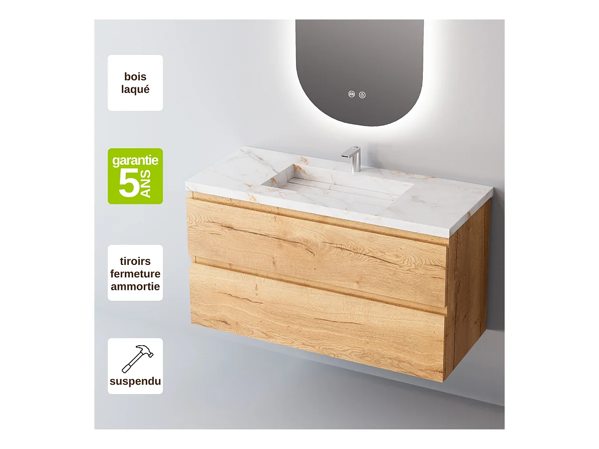 Meuble Salle de Bain STEP (61 cm x H54 x P45 cm), Plan Vasque Grès Cérame BS, 2 Tiroirs, Finition Chêne Clair