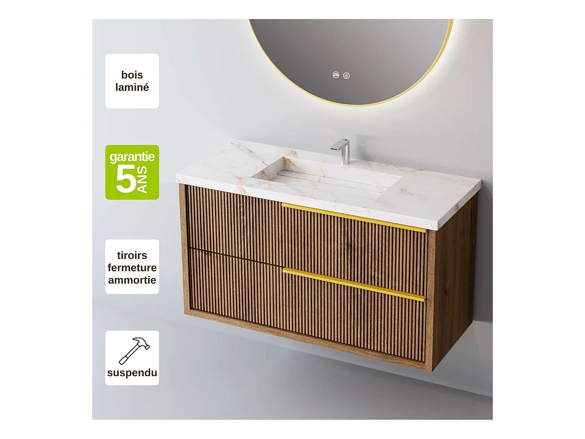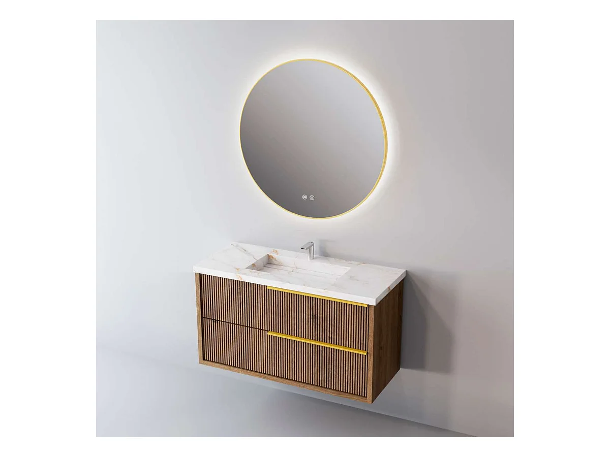 Meuble Salle de Bain TREND (81 cm x H54 x P45 cm), Plan Vasque Grès Cérame BS, 2 Tiroirs Impression 3D Poignée Or, Chêne Foncé