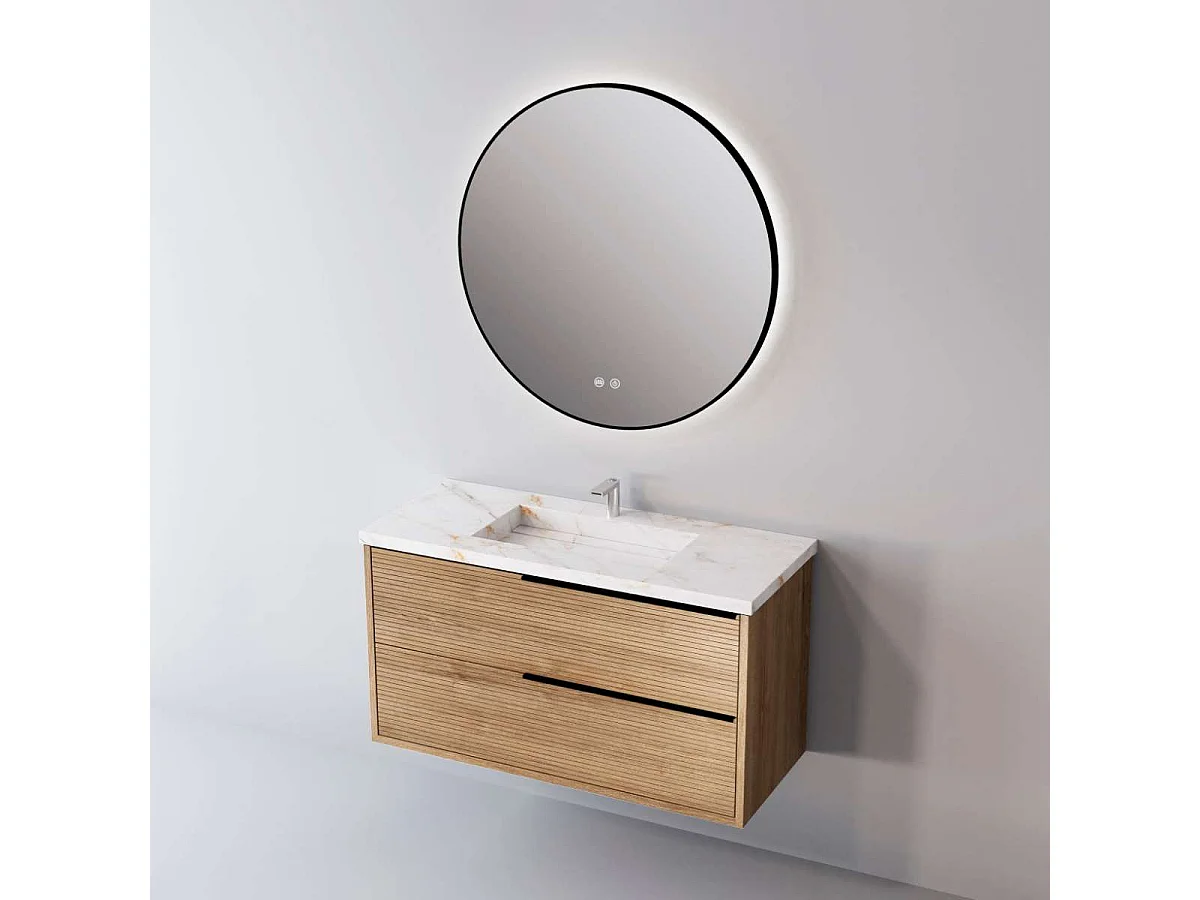 Meuble Salle de Bain LISTELLO (101 cm x H54 x P45 cm), Plan Vasque Grès Cérame BS, 2 Tiroirs Impression 3D Poignée Noir, Chêne Naturel