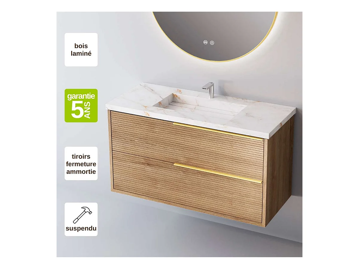 Meuble Salle de Bain LISTELLO (81 cm x H54 x P45 cm), Plan Vasque Grès Cérame BS, 2 Tiroirs Impression 3D Poignée Or, Chêne Naturel